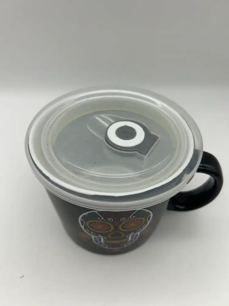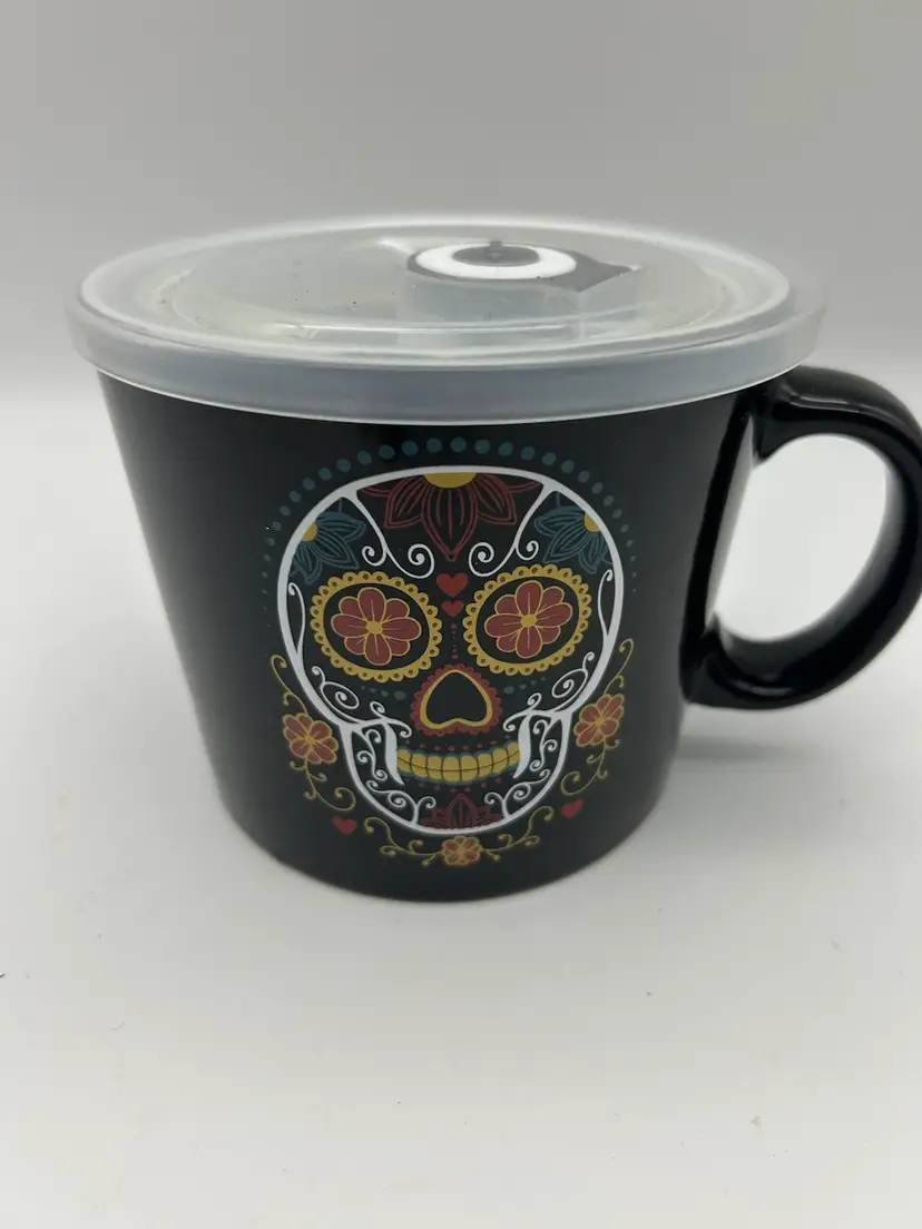 This black ceramic mug is made of ceramic and is microwave and dishwasher safe. It measures approximately 4” tall and 4 1/2” in diameter .