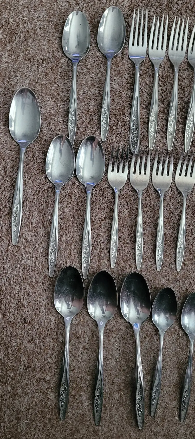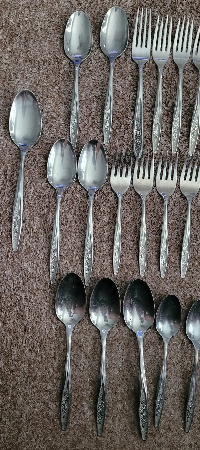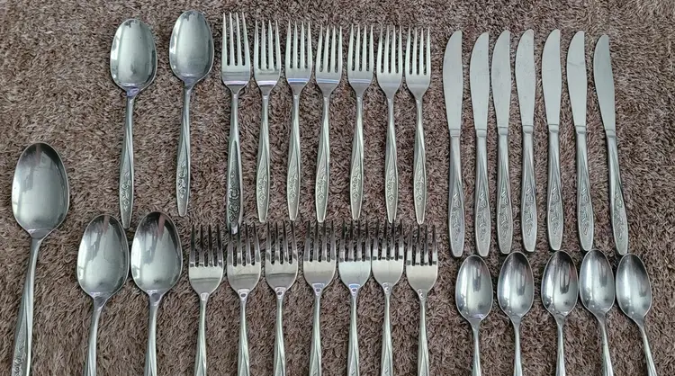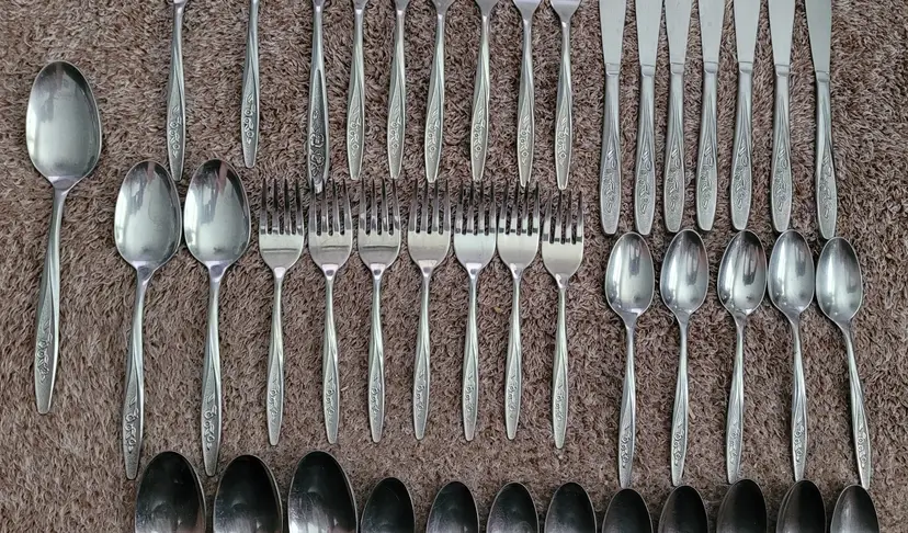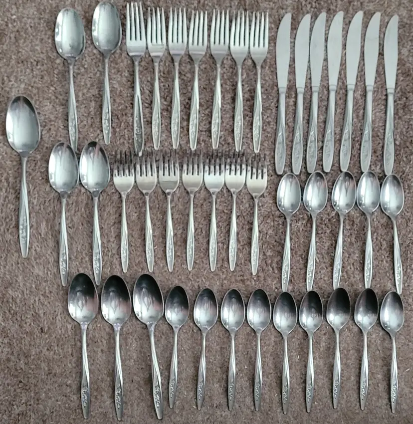 Elevate your dining experience with the Superior Stainless USA Radiant Rose 44 Pieces Flatware Set. Crafted from high-quality stainless steel, this set boasts an elegant floral handle pattern with a vintage/retro style that adds a touch of sophistication to any table setting. The glossy finish enhances the durability and shine of the cutlery, ensuring lasting appeal and functionality. Included in this comprehensive collection are various pieces such as knives, forks, spoons, and a serving spoon, all designed with the intricate rose character detail that reflects a timeless charm. Ideal for adults, this set proudly made in the United States, features a blend of practicality with a classic aesthetic, making it a versatile addition to your dining ensemble. 8 Tableapoons, 14 teaspoons, 7 salad forks, 6 dinner forks, 1 other fork, 7 butter knives