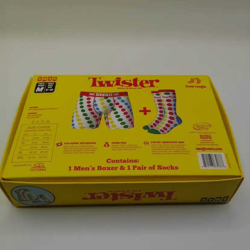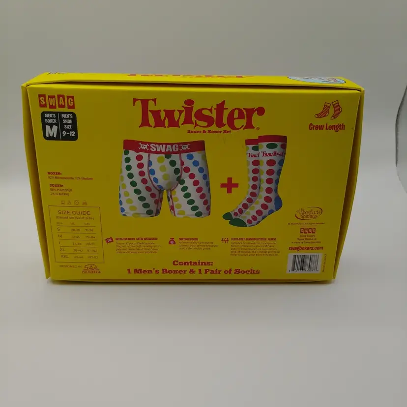 The Swag Twister Boxer Brief in size medium is a new in box underwear option for men. This multicolored boxer brief is made from microfiber fabric, making it machine washable for easy care. With a regular fit and boxer brief style, this underwear is designed for comfort and practicality. Perfect for everyday wear, this stylish boxer brief is a versatile addition to any man's wardrobe.