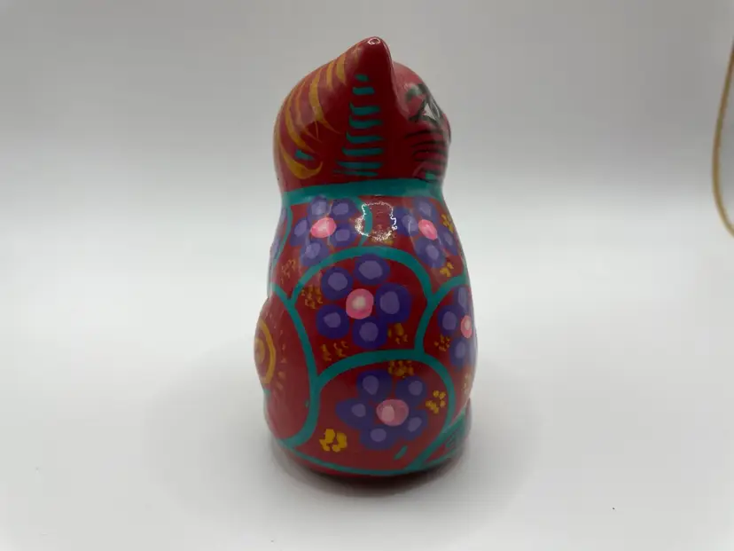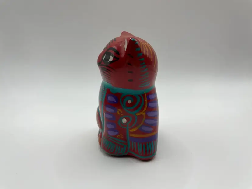 This Talavera Red Cat Figurine is a charming piece of Mexican folk art, hand-painted with vibrant multicolor flowers and a striped design. Standing at 3.5 inches tall, this ceramic figurine is glazed and features intricate details typical of Talavera pottery. Handmade in Mexico, this collectible item reflects the rich cultural heritage and craftsmanship of Mexican artistry, making it a unique and eye-catching addition to any collection or decor.