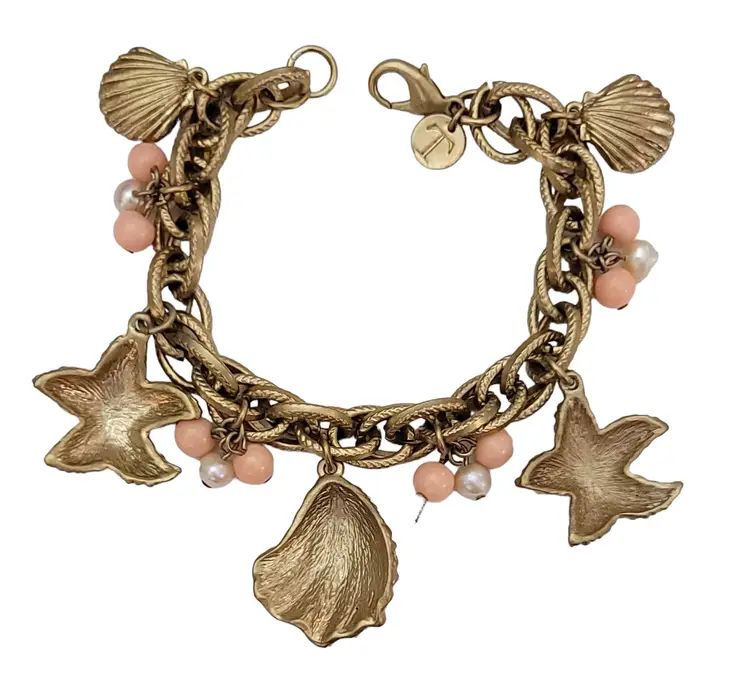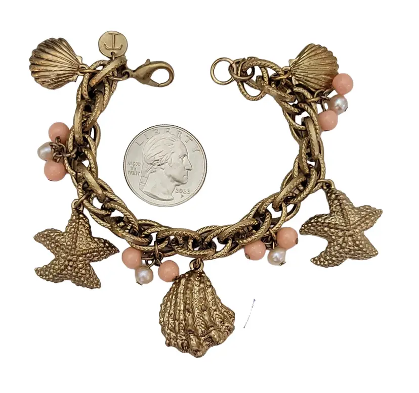 This trendy shell bracelet by Talbots is an ideal piece to dress up any casual outfit. The charms consist of sea creatures the likes of sea shells and starfish with intricate detail attached to textured chunky chains in intertwined assembly. Accented with pink beads and white genuine pearls alternately placed in between the charms. This bracelet measures 7.5 inches in total length. A round metal tag stamped T on a chain holding the lobster clasp, will keep this bracelet securely clasped together.