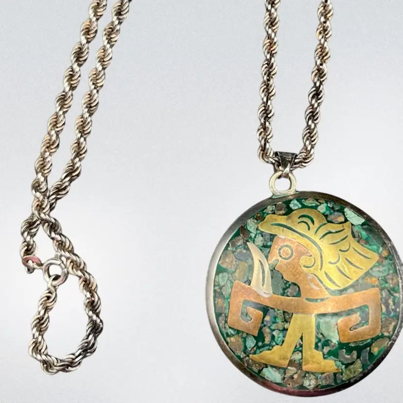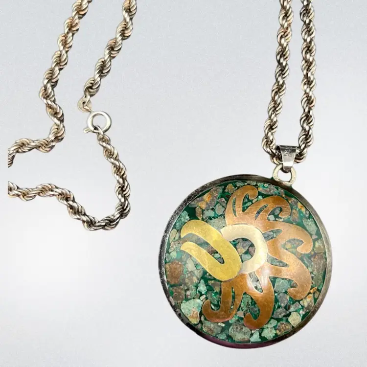 Taxco Mexico 925…Pendant And Chain Sterling Silver, Copper, Turquoise Inlay Pendant With Twist Rope Chain 14” long Pendant 2” diameter Signed on pendant clasp In excellent vintage preowned condition. In need of a really good polishing! Please see pictures for more detail Thanks for looking 🌸
