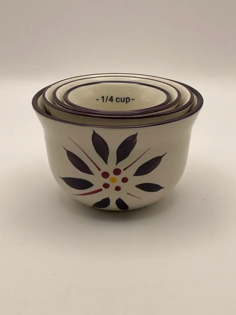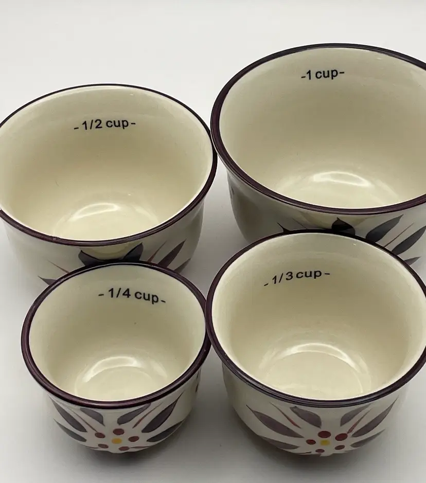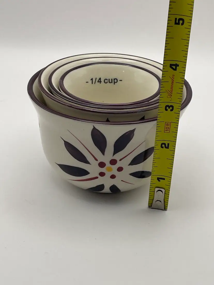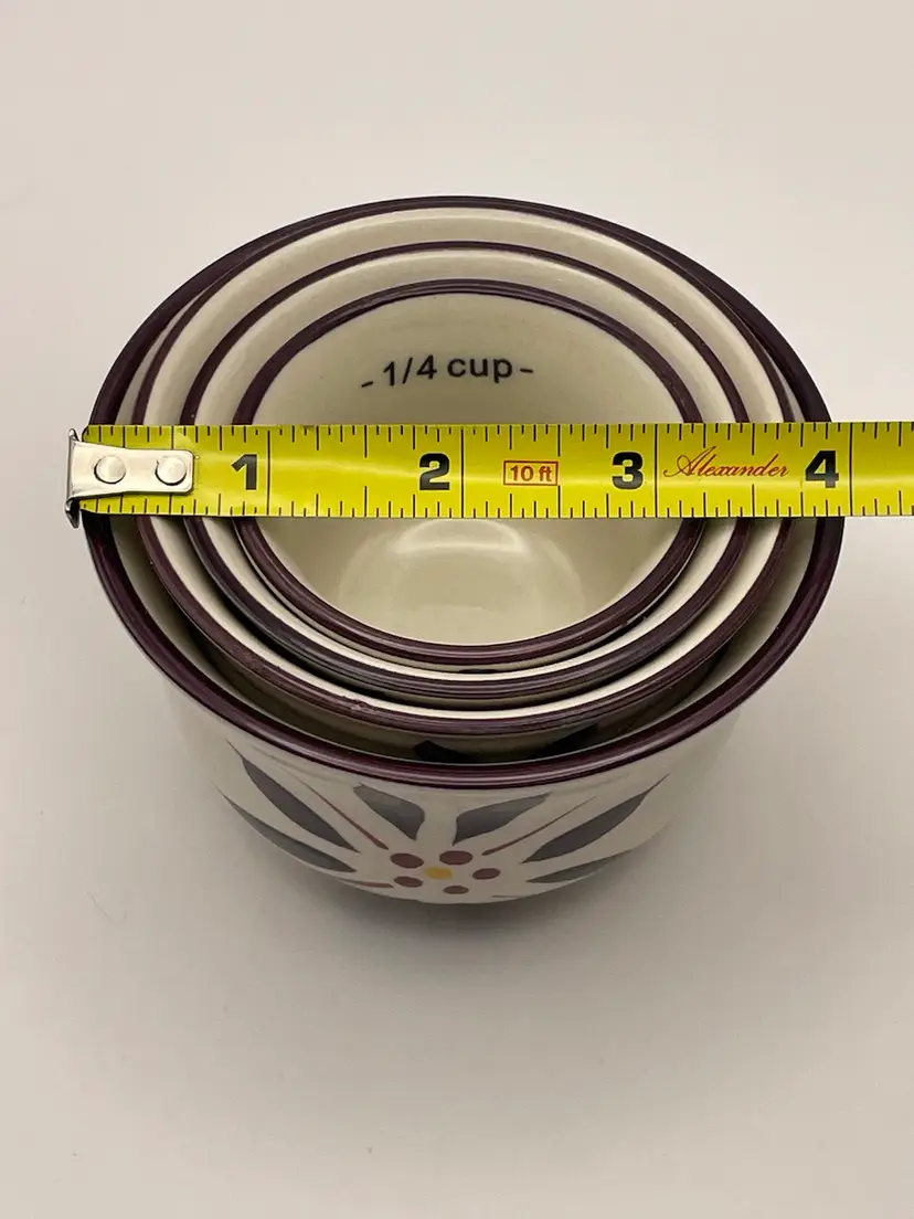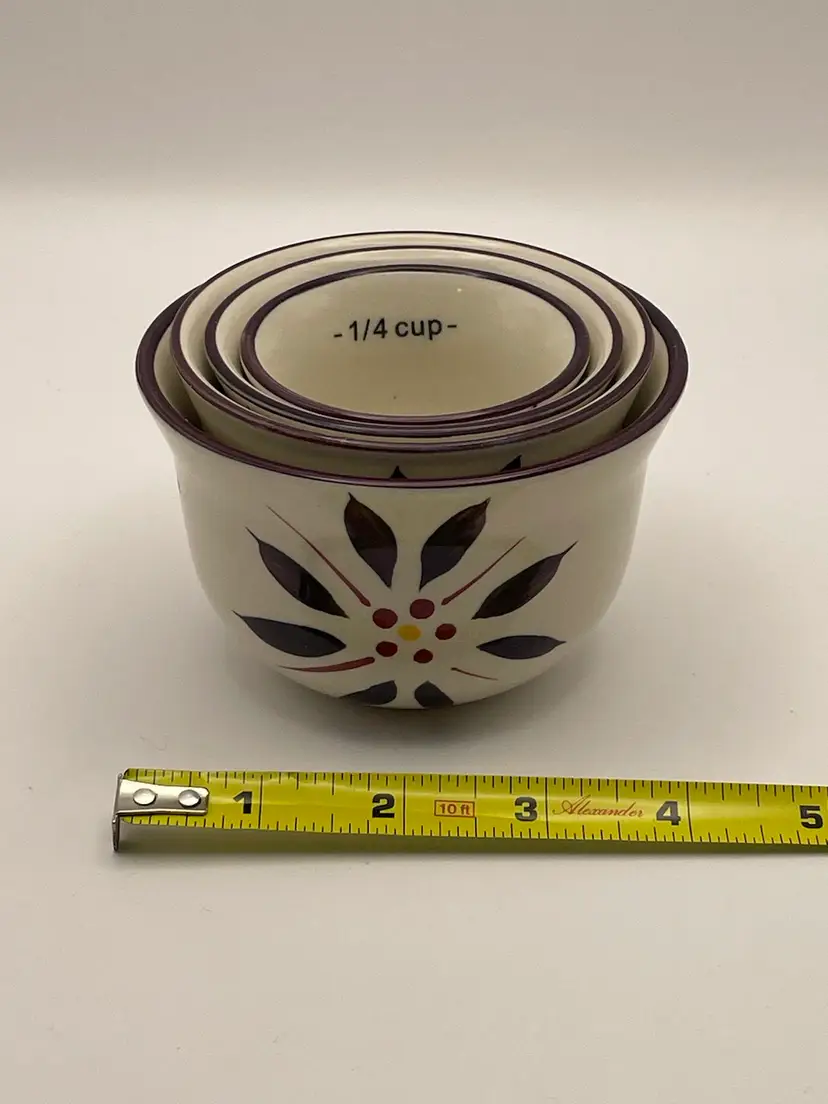 temp-tations, “Old World”, set of 4 stackable ceramic measuring cups, floral, deep purple/cranberry. Great condition! Please see pictures for measurements.