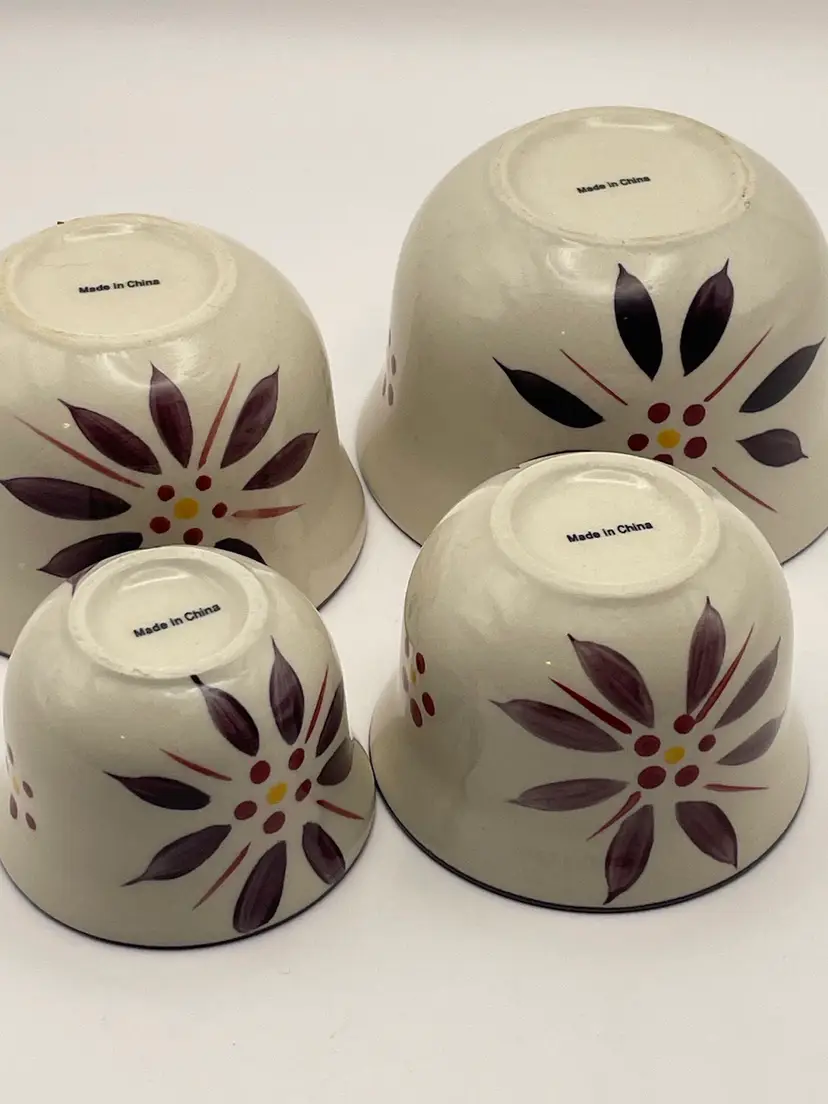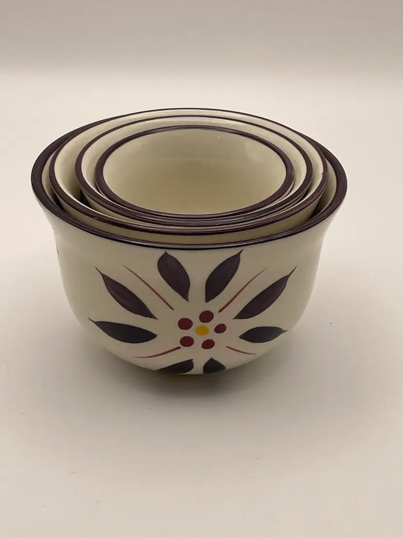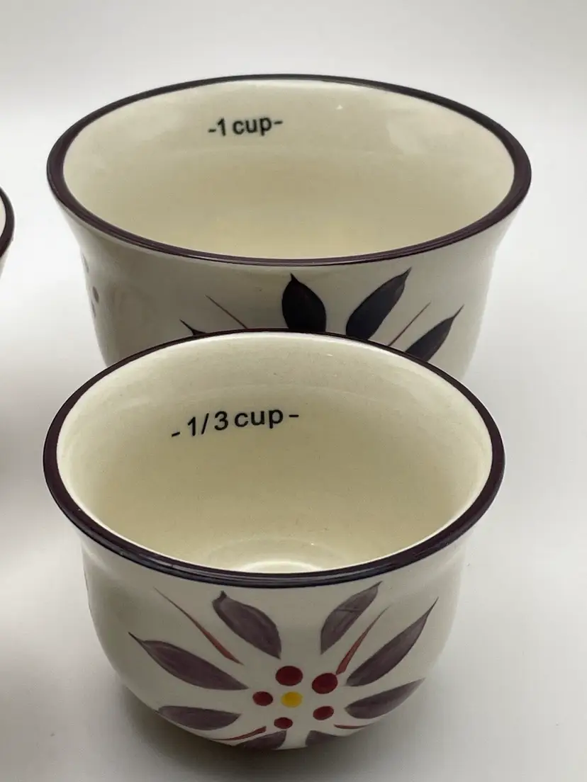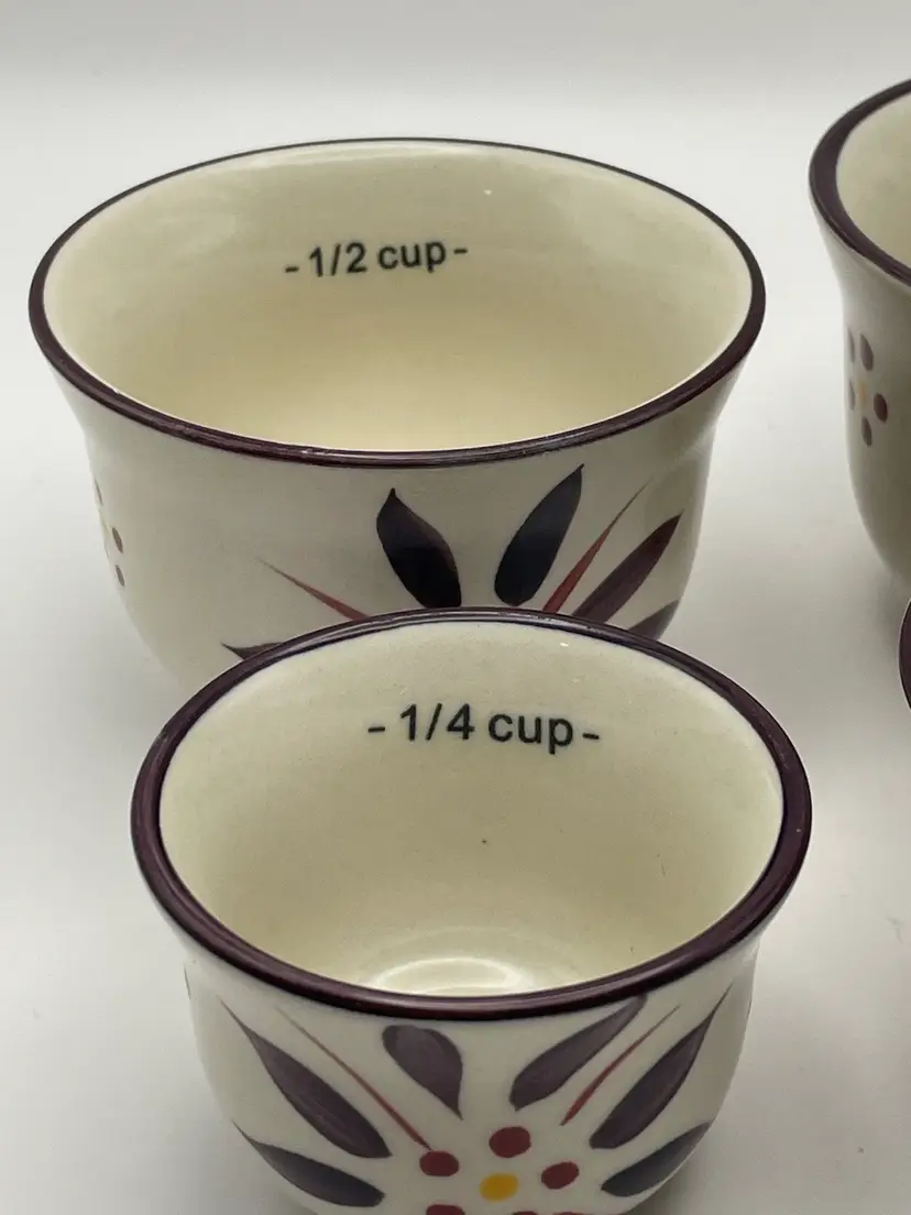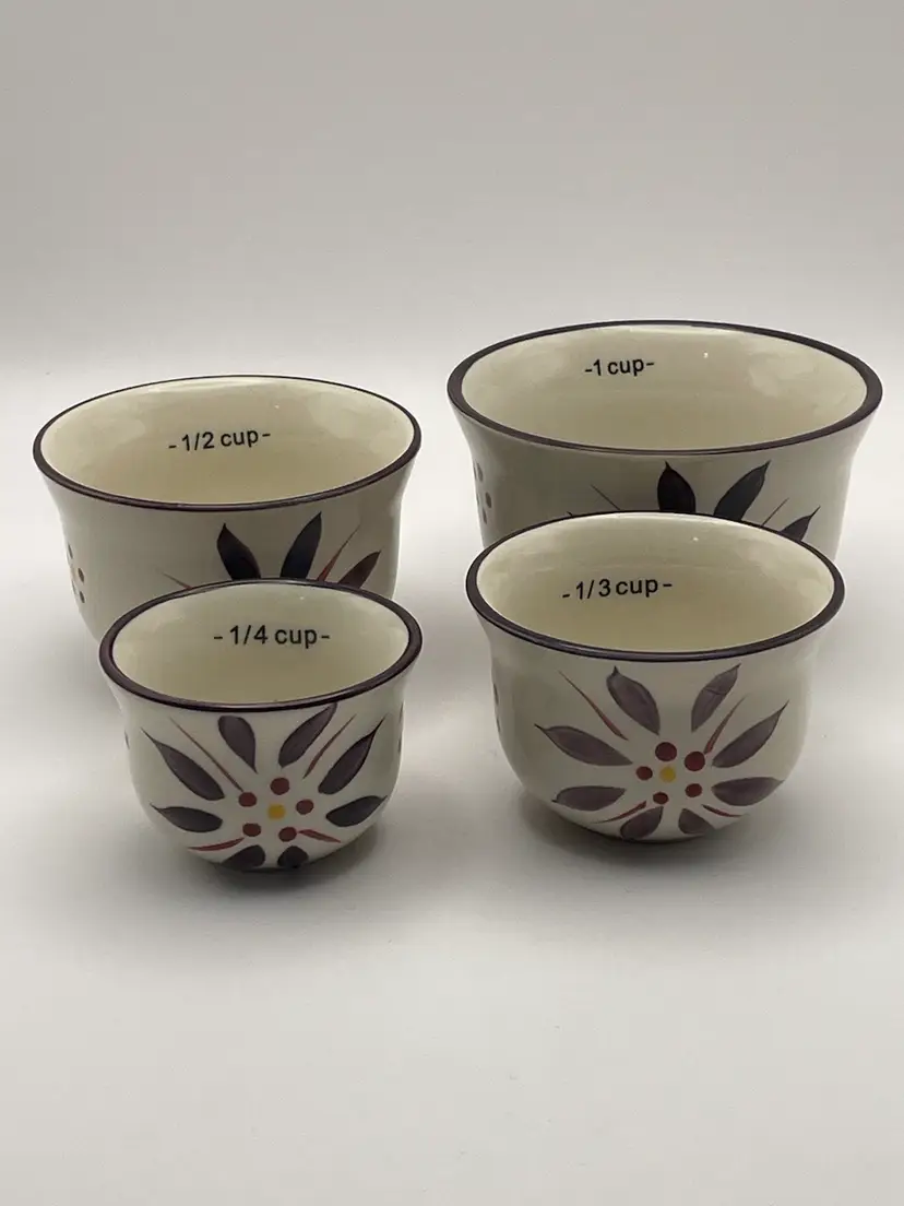 temp-tations, “Old World”, set of 4 stackable ceramic measuring cups, floral, deep purple/cranberry. Great condition! Please see pictures for measurements.