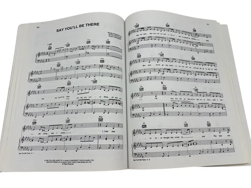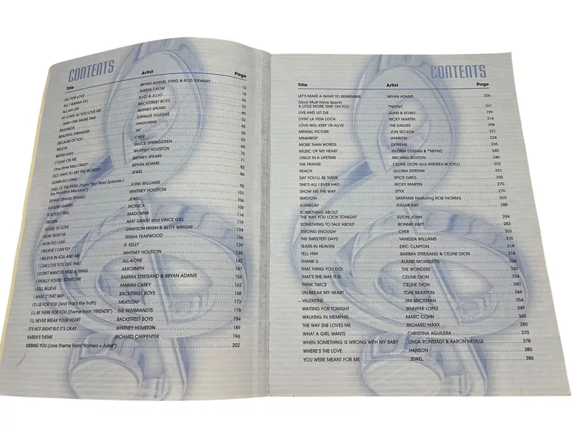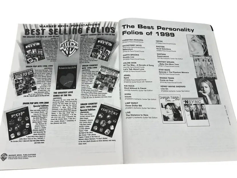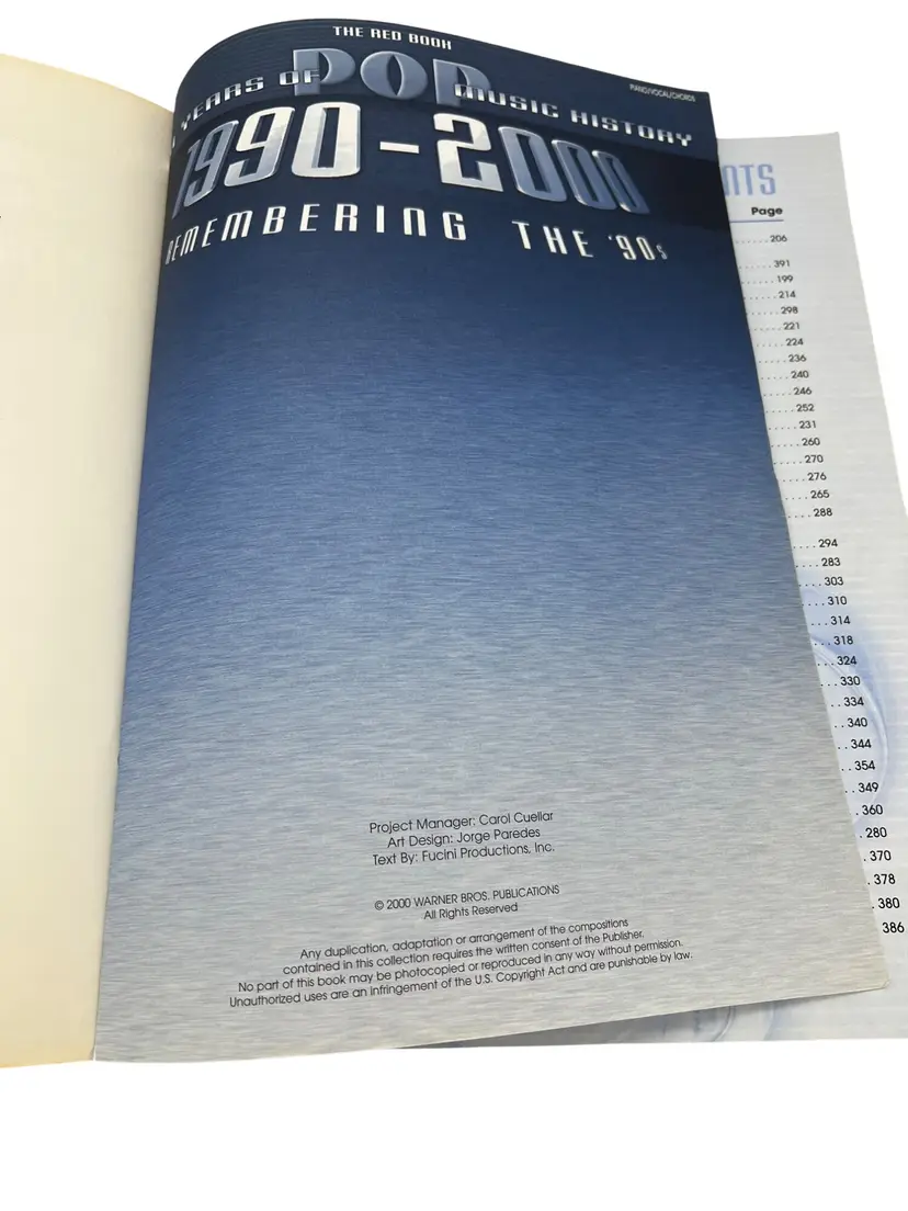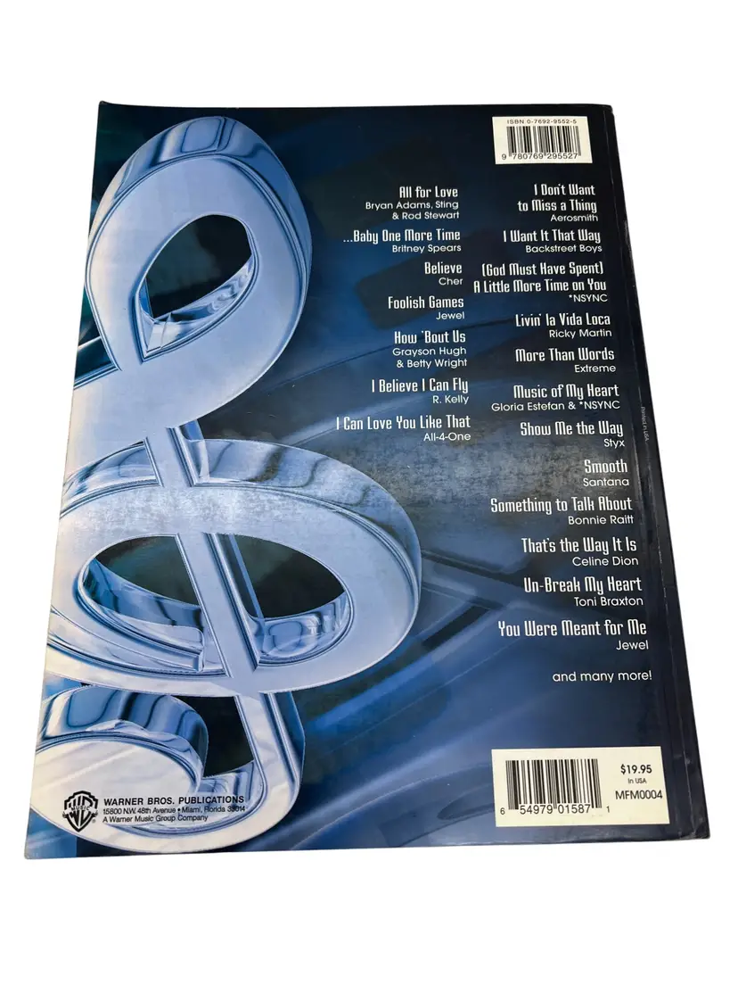 Comprehensive ’90s pop anthology from Warner Bros. Publications (The Red Book), arranged for piano/vocal/chords. Big 12" x 9" folio, 395 pages, ISBN 0-7692-9552-5, code MFM0004. Features dozens of chart favorites from artists like Britney Spears, Backstreet Boys, Cher, Aerosmith, Jewel, Ricky Martin, Celine Dion, Toni Braxton, and more. Ideal for players, singers, teachers, and 1990s nostalgia.
