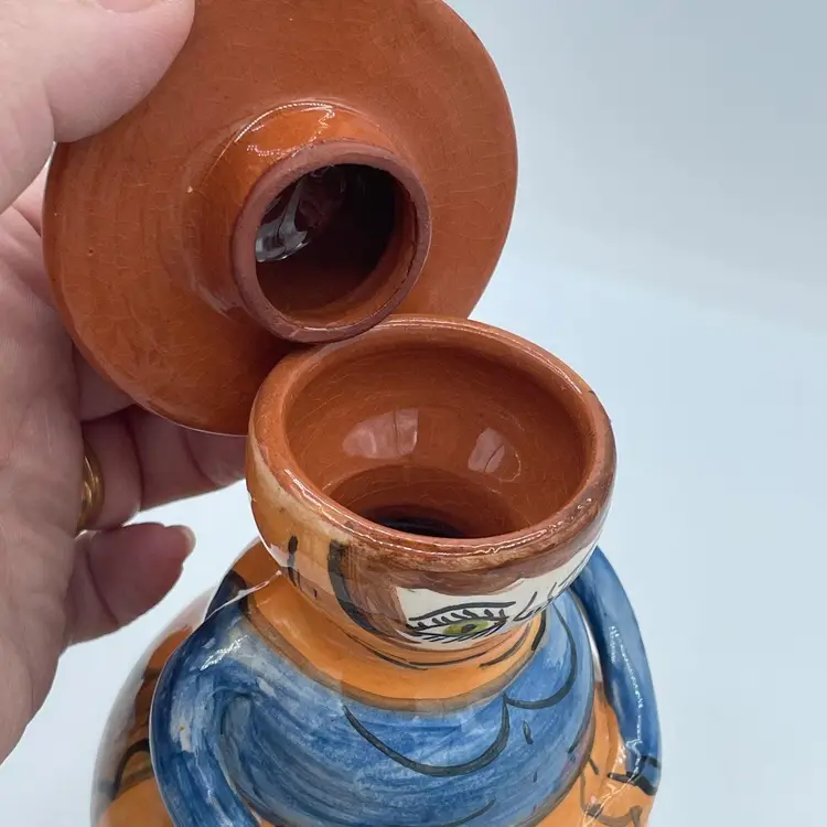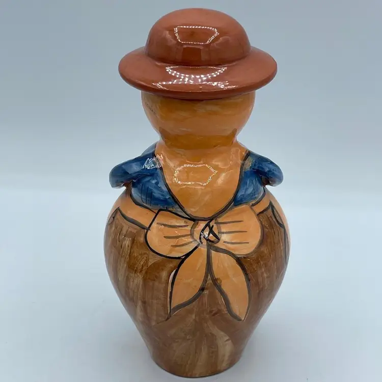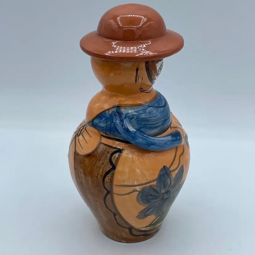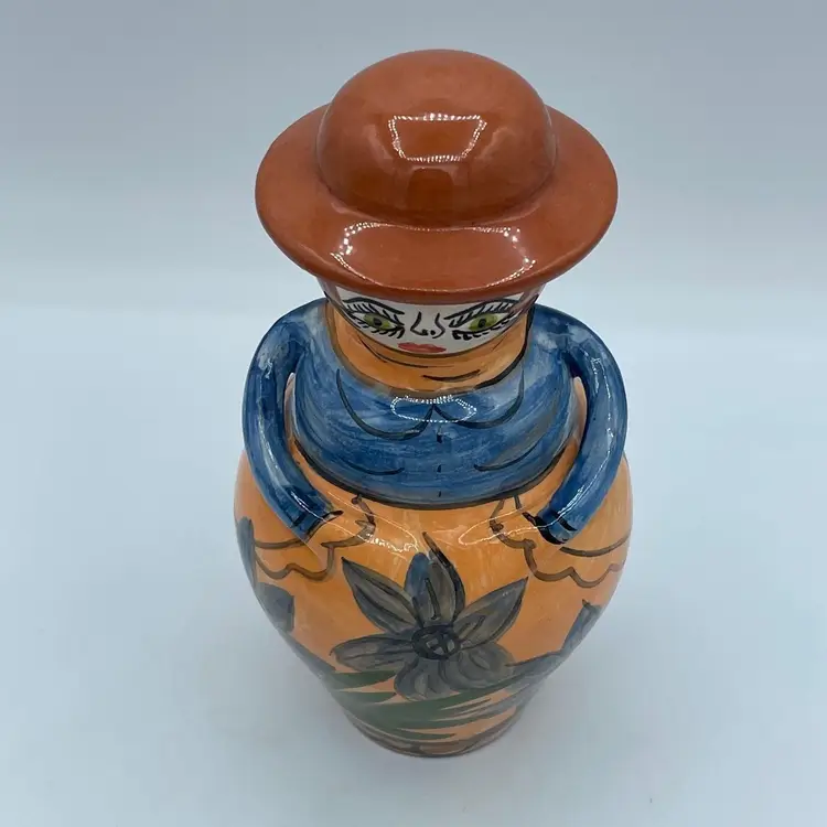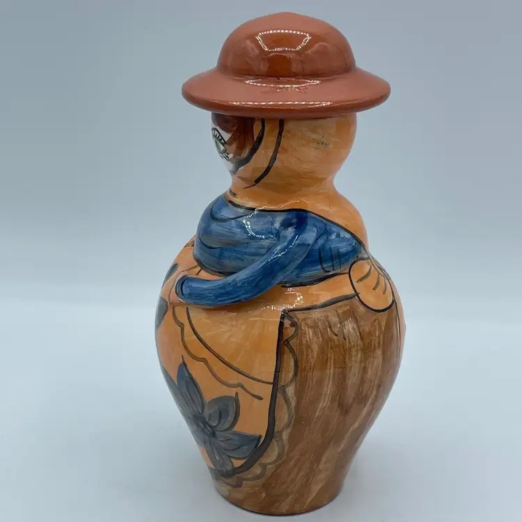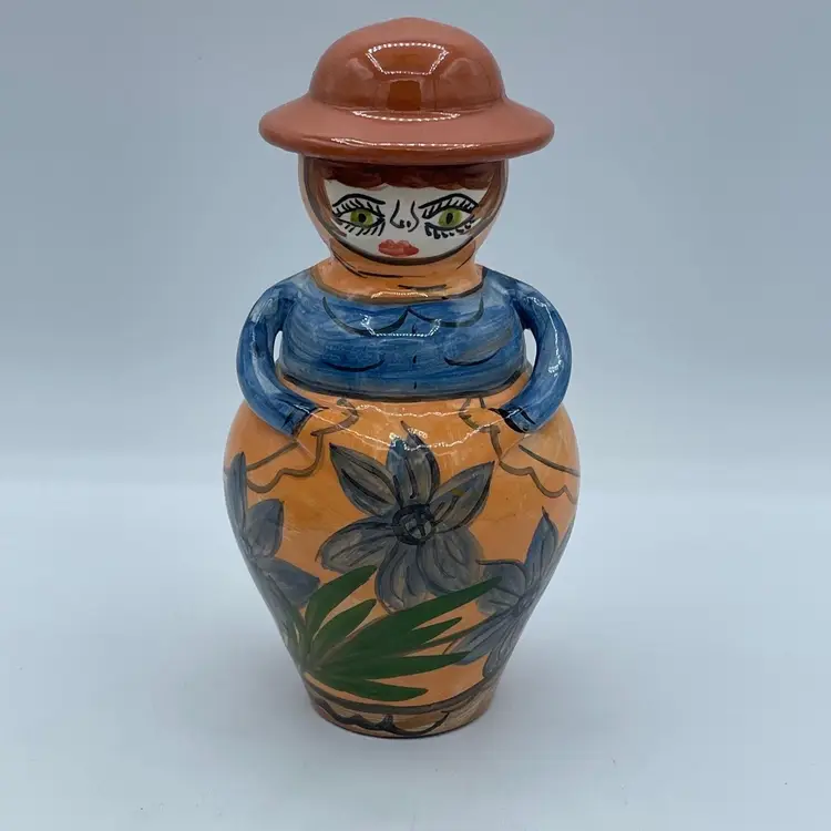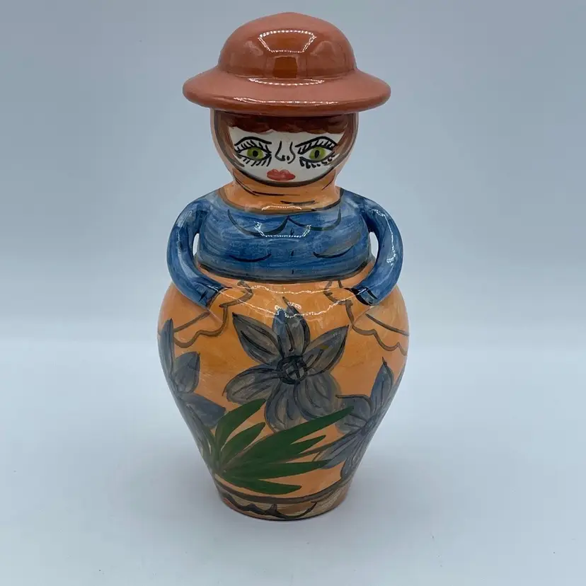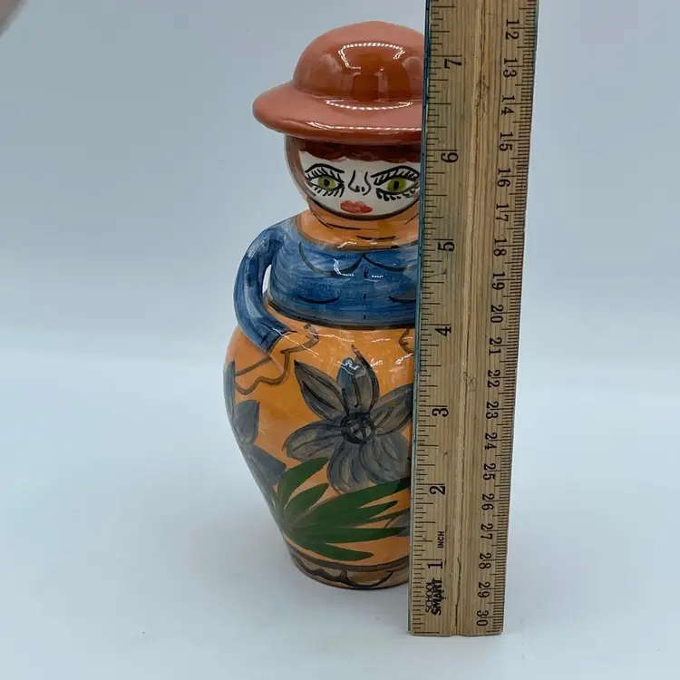 Such a unique vintage find! Love that her hat is the if of this bottle or jug. Not 100% sure of its purpose. Hat could be removed and used as a vase or just used as a fun decorative piece of art. Difficult to read the signature on bottom, but found a similar one online signed OLIVEIRA Corval Portugal. Take a look for yourself!