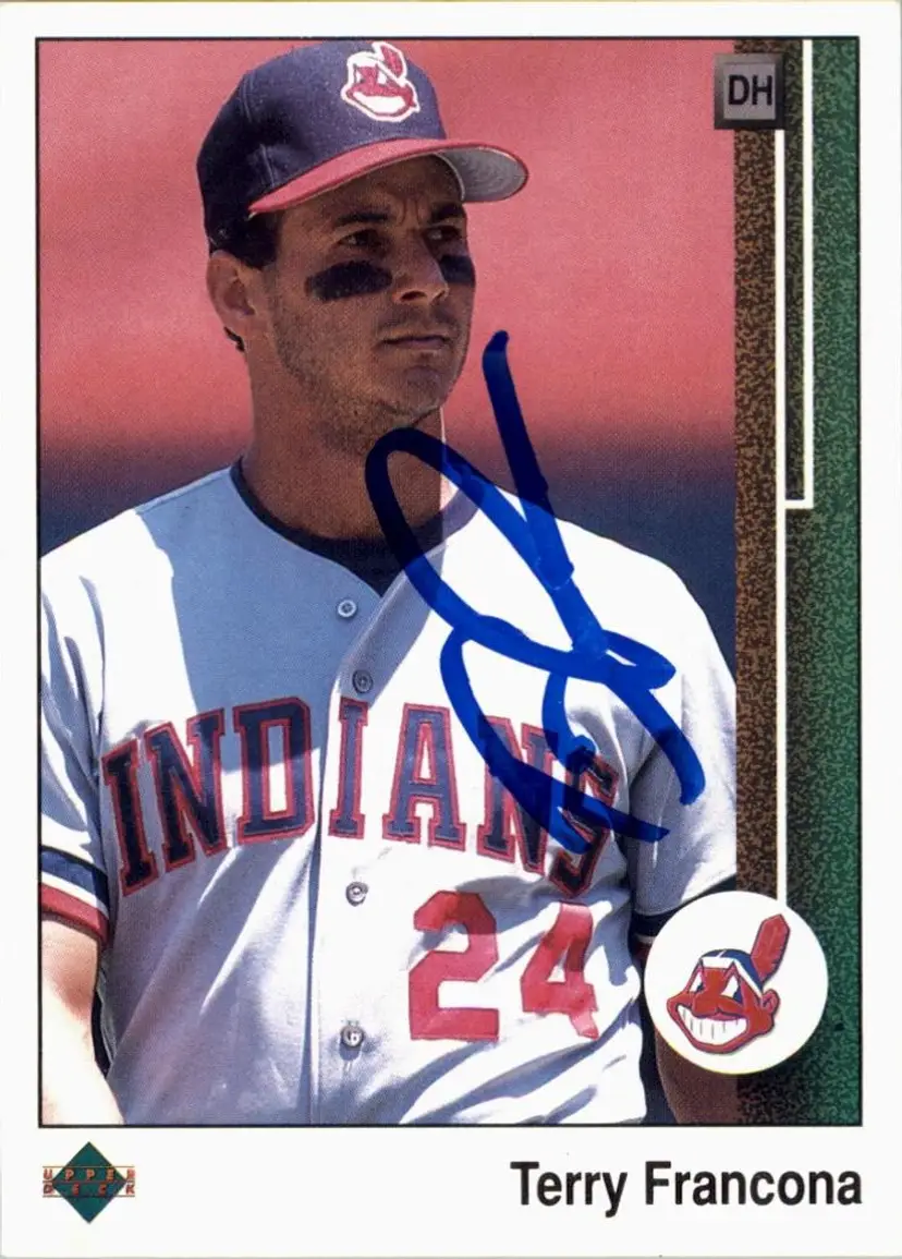 Authentic 1989 Upper Deck baseball card featuring Terry Francona of the Cleveland Indians, signed in blue ink. A must-have for Indians fans and collectors of autographed sports memorabilia. Your purchase supports Signatures For Soldiers in helping homeless and disabled veterans.