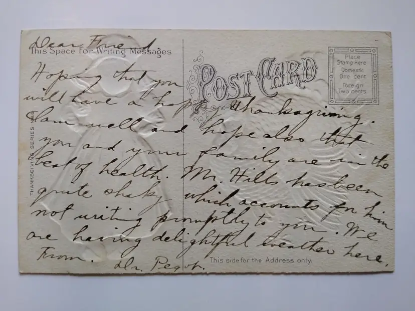 Size: Standard (5.5 x 3.5 in) Custom Bundle: No Type: Printed (Lithograph) Year Manufactured: 1909 Number of Items in Set: 1 Original/Licensed Reprint: Original Occasion: Thanksgiving Time Period Manufactured: 1900-1919 Unit of Sale: Single Unit Era: Pre-War (Pre-1914) Artist: Frances Brundage Country/Region of Manufacture: Unknown Material: Paper Theme: Animals, Art, Greetings, Holiday, Children & Infants, Turkey Features: Divided Back, Embossed Subject: Dutch Girl Postage Condition: Unposted Brand/Publisher: Unbranded