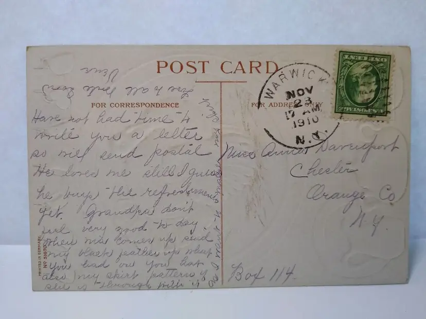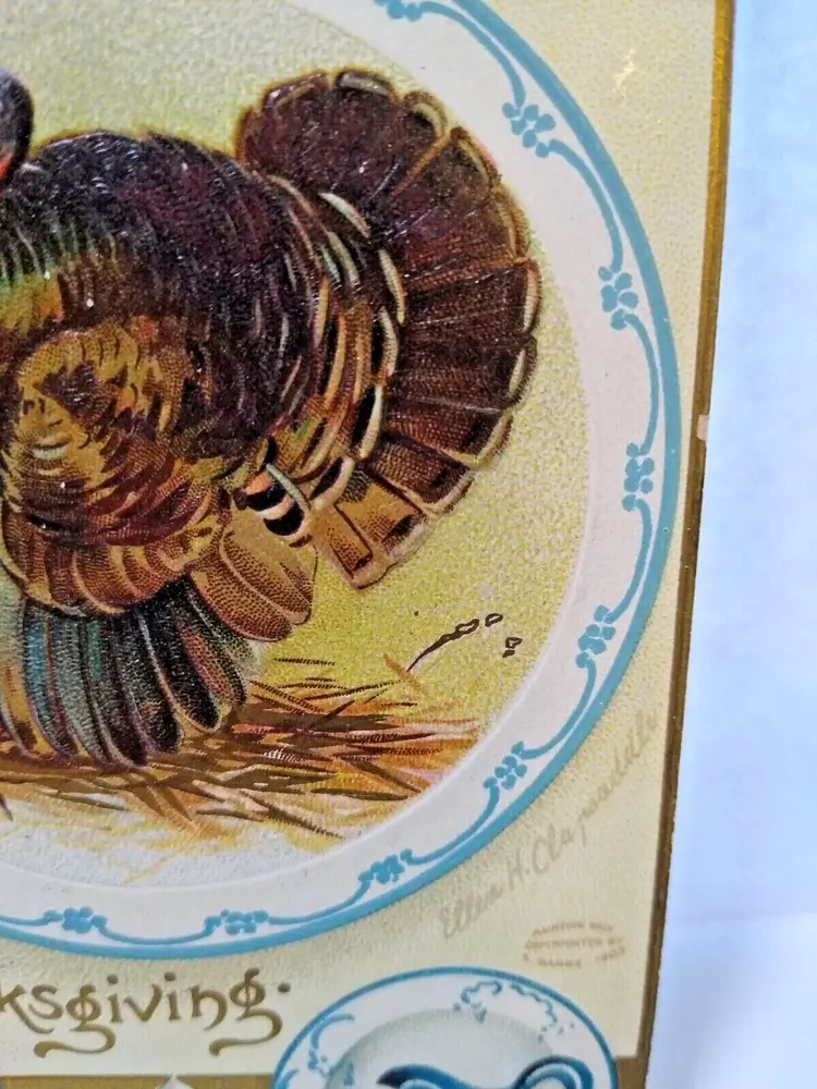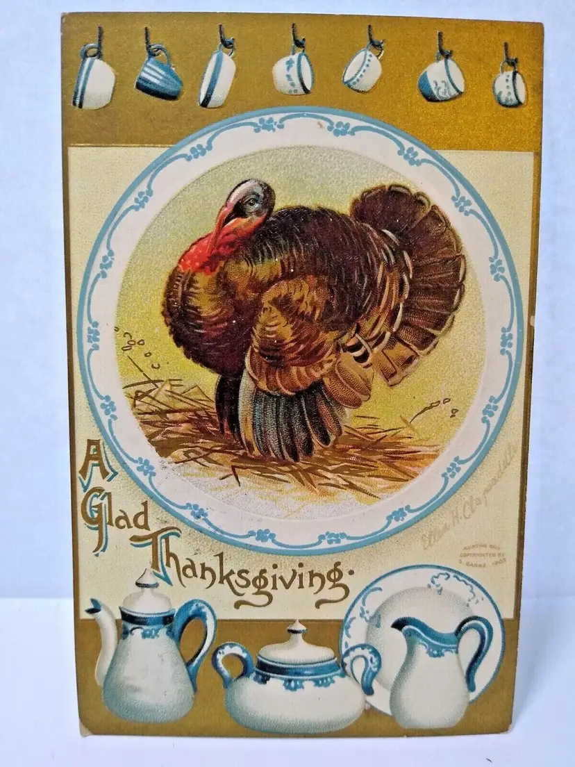 Size: Standard (5.5 x 3.5 in) Custom Bundle: No Personalize: No Type: Printed (Lithograph) Year Manufactured: 1909 Number of Items in Set: 1 Signed: Yes Original/Licensed Reprint: Original Signed By: Ellen H. Clapsaddle Occasion: Thanksgiving Time Period Manufactured: 1900-1919 Unit of Sale: Single Unit Era: Pre-War (Pre-1914) Artist: Ellen Clapsaddle Country/Region of Manufacture: Germany Material: Paper Theme: Animals, Art, Greetings, Holiday, China, Flow Blue Features: Divided Back, Embossed Subject: Turkey Postage Condition: Posted Brand/Publisher: S. Garre Franchise: Unknown