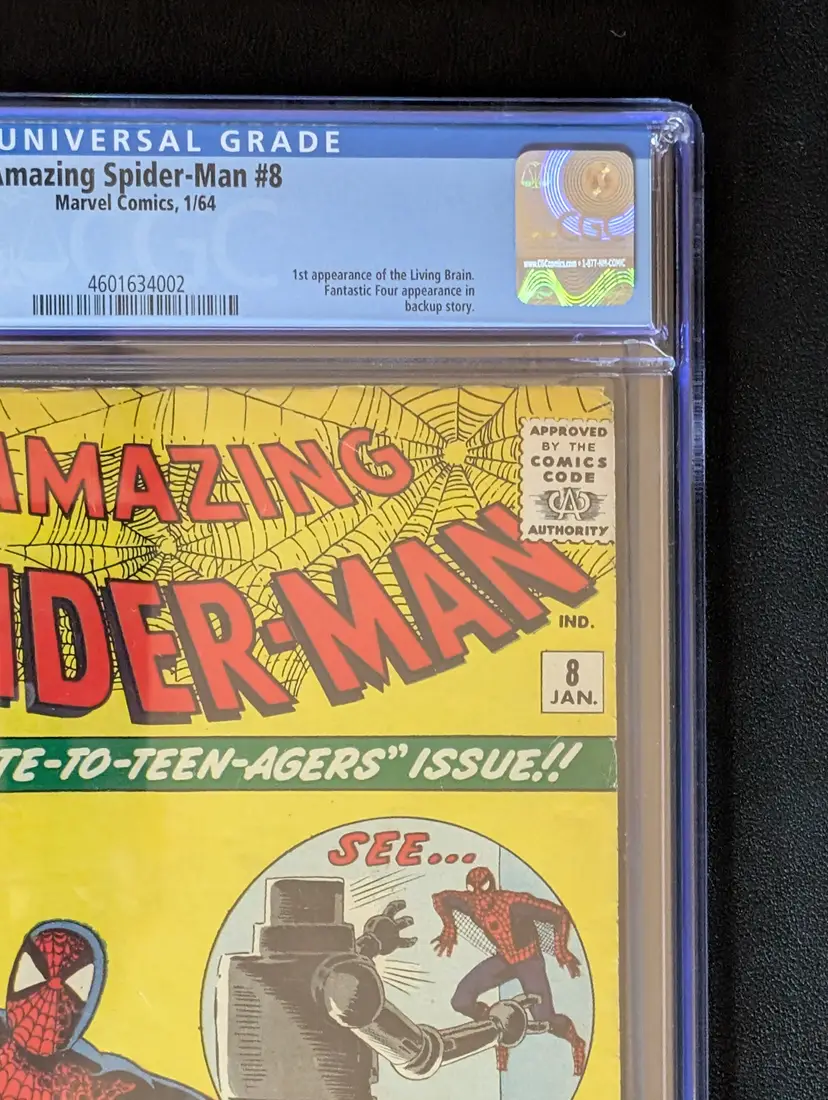 The Amazing Spider-Man #8 (Jan 1964) – CGC 3.5 VG // 1st Appearance of the Living Brain!Swing back to the early days of Spidey with this Silver Age classic! Amazing Spider-Man #8 features the first appearance of the Living Brain, plus a bonus boxing match between Peter Parker and Flash Thompson! Written by Stan Lee and illustrated by Steve Ditko, this issue is a must-have for collectors chasing key early ASM appearances.⭐CGC 3.5 Cert #: 4601634002🔑 Key Highlights: 🧠 1st appearance of the Living Brain 🥊 Peter Parker vs. Flash Thompson boxing match 🕷️ Early Stan Lee & Steve Ditko collaboration 📈 Silver Age Marvel key 💥 CGC 3.5 (Very Good) – Encapsulated and preserved✍️ Writer: Stan Lee 🎨 Interior Artist: Steve Ditko 🖼️ Cover Artist: Steve Ditko 🗓️ Published: January 1964 🏢 Publisher: Marvel Comics⭐ More photos available upon request ⭐ Open to reasonable offers!📌 Condition Notice: This comic is professionally graded and encapsulated by CGC with a grade of 3.5 VG. Please refer to photos of the slab for more details, and feel free to request additional images or information.💬 Customer Satisfaction: If you have concerns about your order or pricing, please reach out directly. I'm happy to work with you to make things right!