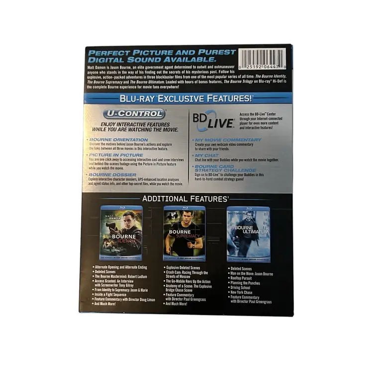 The Bourne Trilogy Blue Ray Pre-loved. Great for any action junky. Watch all 3 with ease when you purchase the trilogy. Get ready for non-stop action, edge-of-your-seat suspense and spectacular chase sequences with everyone’s favorite assassin in The Bourne Trilogy! Matt Damon is Jason Bourne, an elite government agent determined to outwit and outmaneuver anyone who stands in the way of his finding out the secrets of his mysterious past. Follow his explosive, action-packed adventures in three blockbuster films from one of the most popular series of all time: The Bourne Identity, The Bourne Supremacy and The Bourne Ultimatum. Loaded with hours of bonus features, The Bourne Trilogy is the complete Bourne experience for movie fans everywhere!