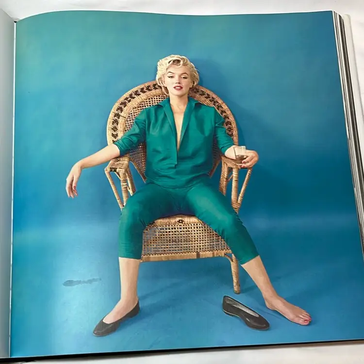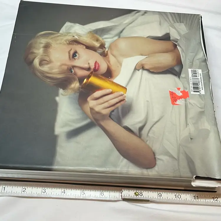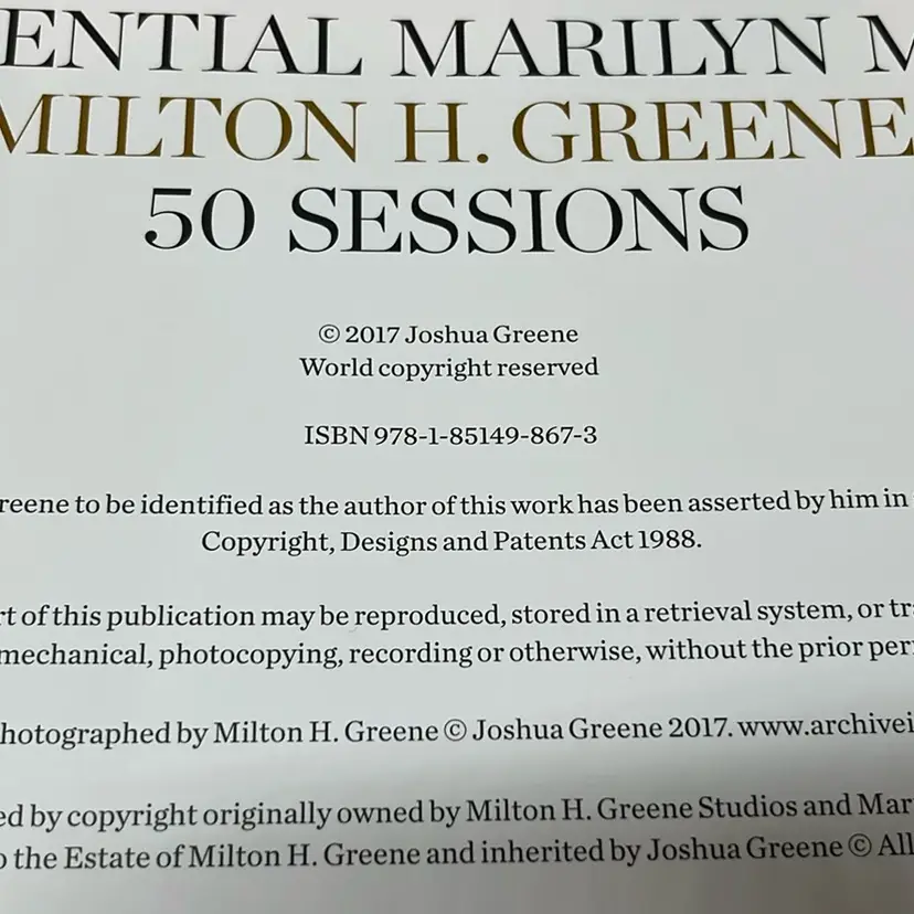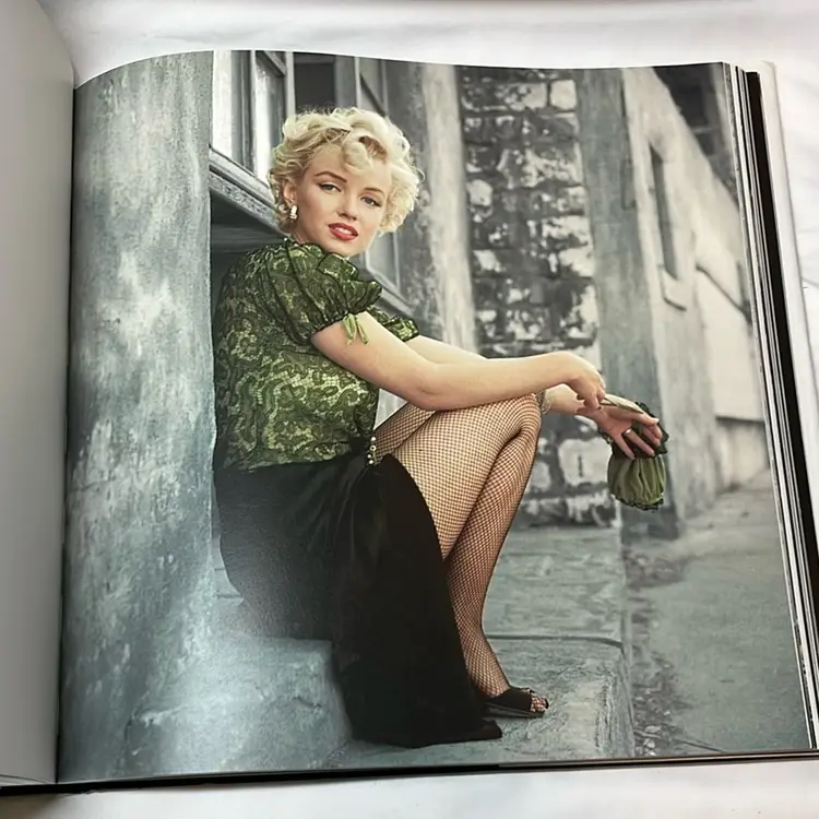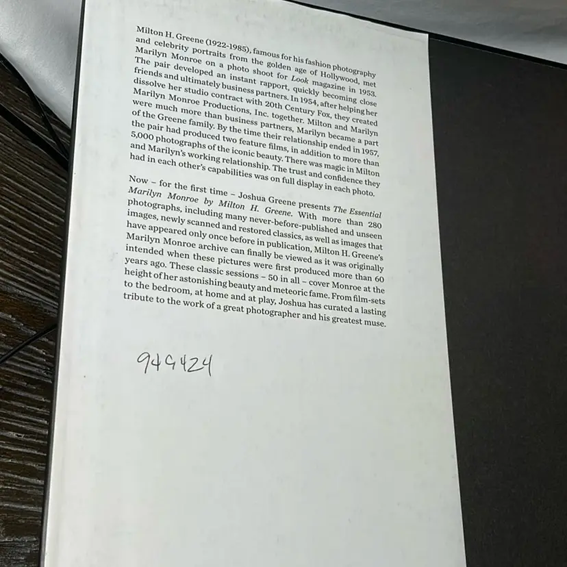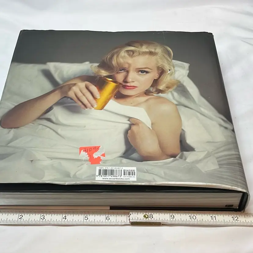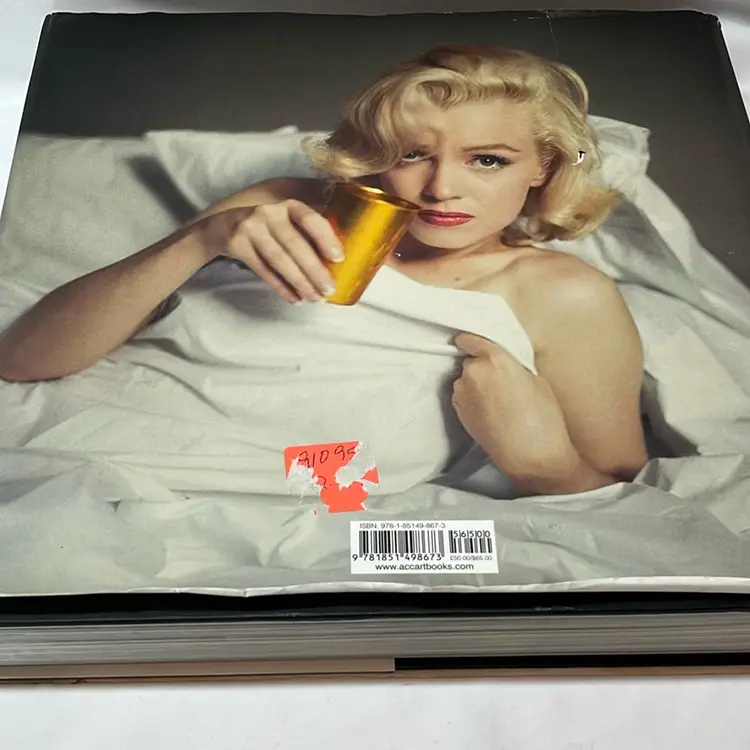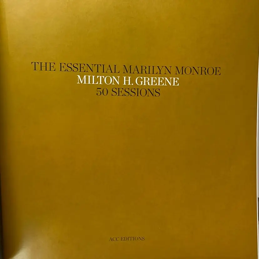 The Essential Marilyn Monroe Milton H Greene: 50 Sessions hardcover photo book. This is a stunning large book filled with beautiful Marilyn photographs. The slip cover has seen better days and has a sticker that can be removed. Pages inside look good with no rips or tears. Some pages have very slight yellowing along the edges as shown.