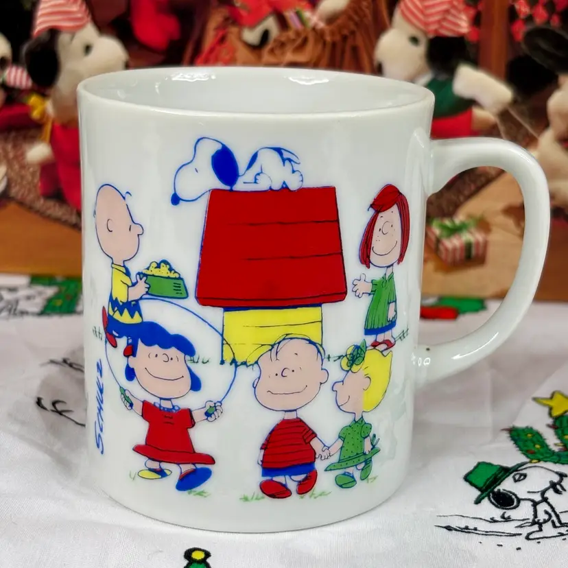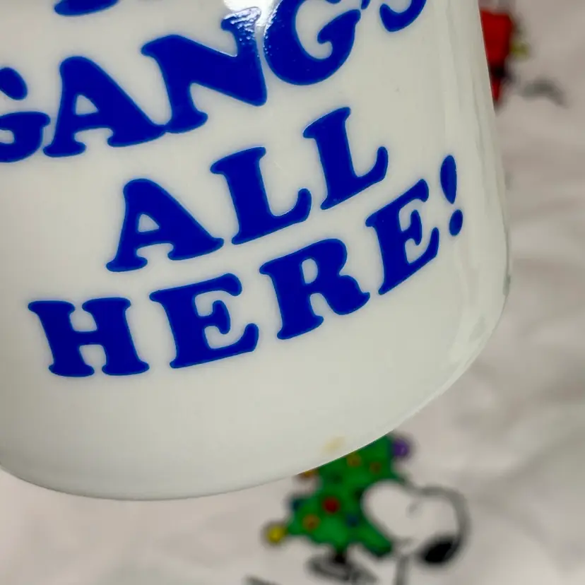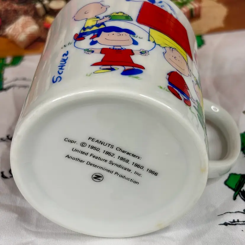 This is a classic mug featuring the Peanuts Gang! We have Charlie Brown, Snoopy, Lucy, Linus, Sally, and Peppermint Patty. Made by Determined Productions. Has a few spots as seen in the photos. Otherwise, this mug is in great condition with no chips or cracks. Add it to your collection today!