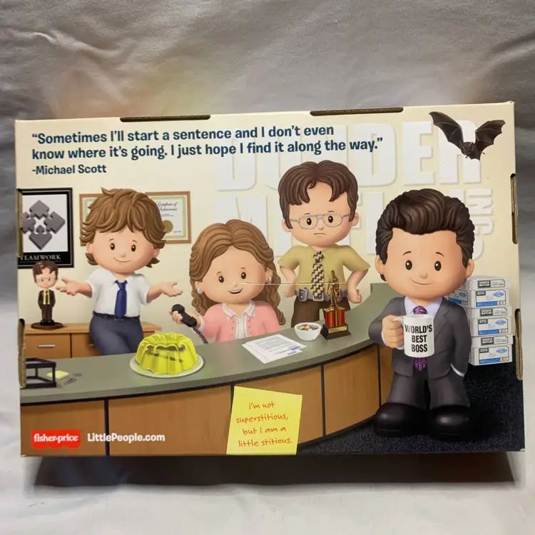 The Office Figure Set by Little People Collector features Michael, a character from the popular TV show "The Office." This set, released in 2020, is part of the Little People collection and is suitable for ages 1 to 101. Perfect for fans of the show or collectors of Little People figures, this set allows for imaginative play and displays the characters in a miniature form. Ideal for preschoolers and adults alike, this toy brings the beloved characters to life with its unique design and attention to detail.