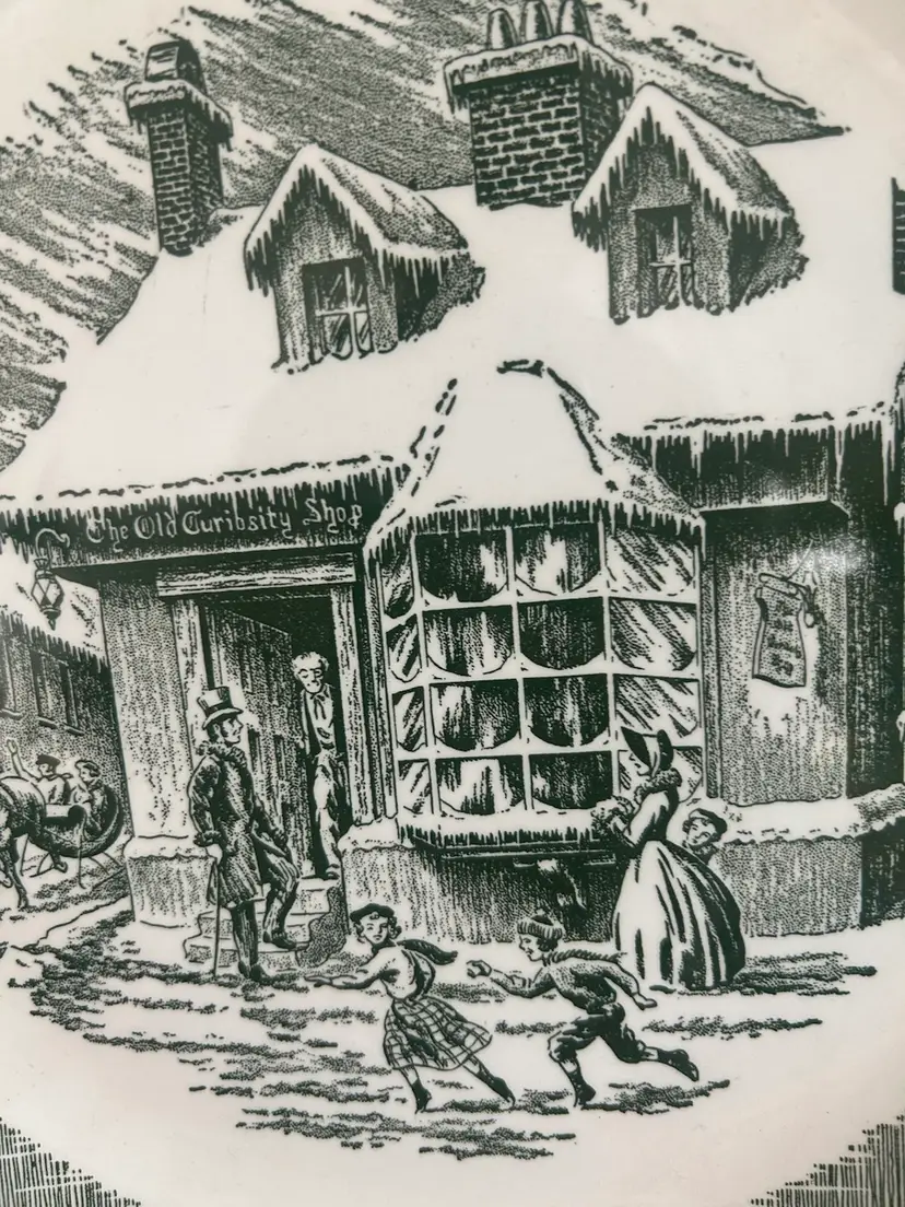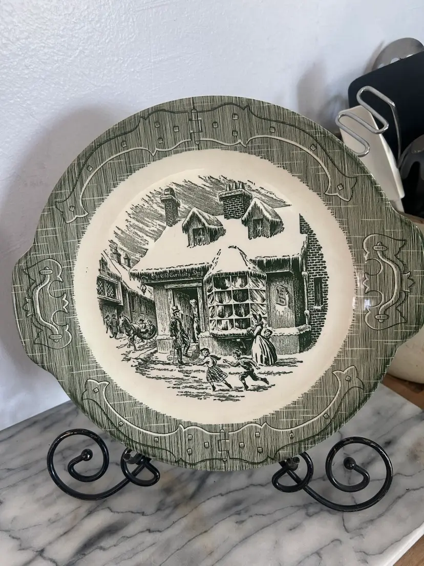vintage Royal China "The Old Curiosity Shop" handled cake plate. The plate features a green transferware design inspired by Charles Dickens' novel "The Old Curiosity Shop", featuring a Victorian winter scene. Perfect for Holiday display or dessert. It was crafted in the mid-20th century, likely in the 1950s, in the USA. The plate is approximately 10 5/8 inches in diameter and 11 3/4 inches wide including the handles. It is a discontinued pattern