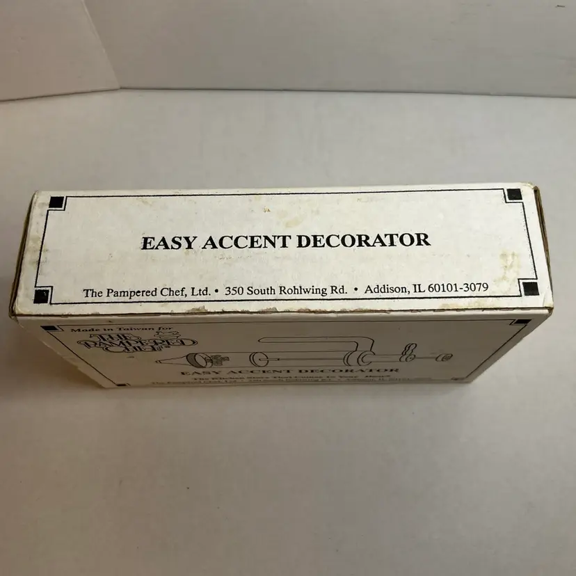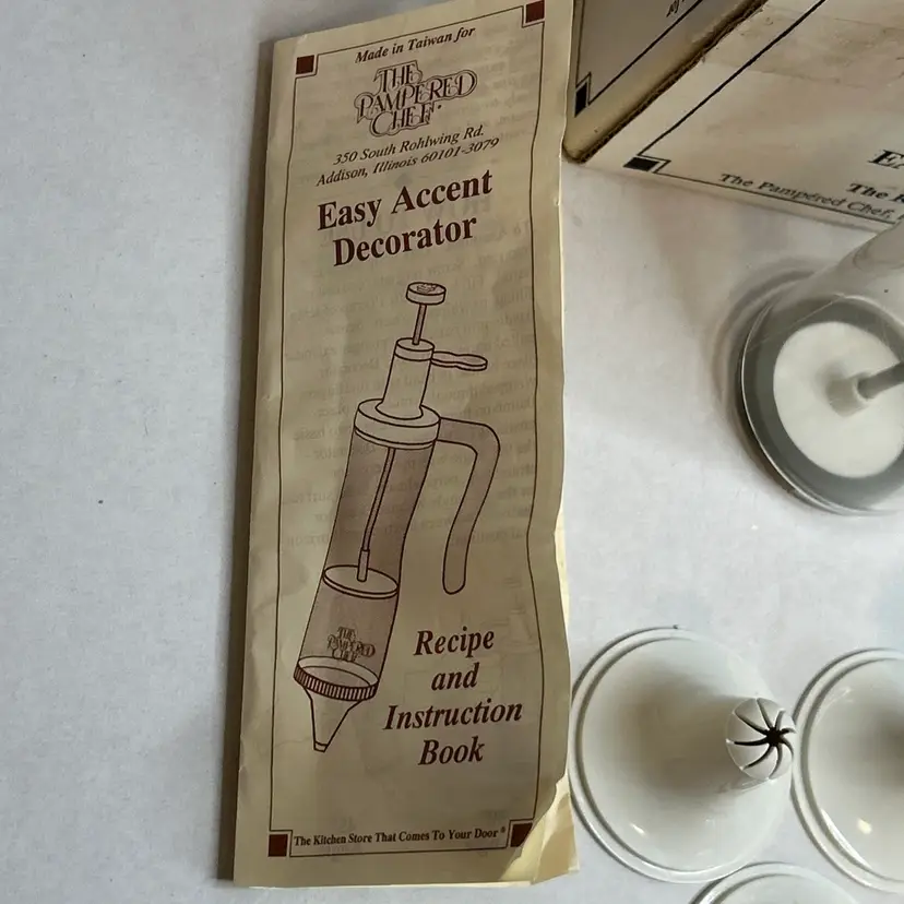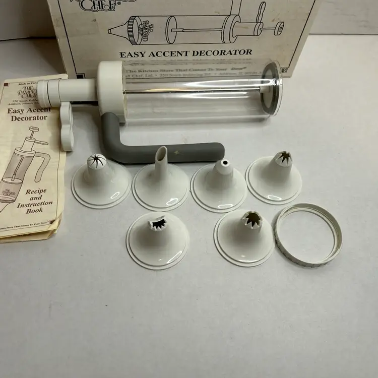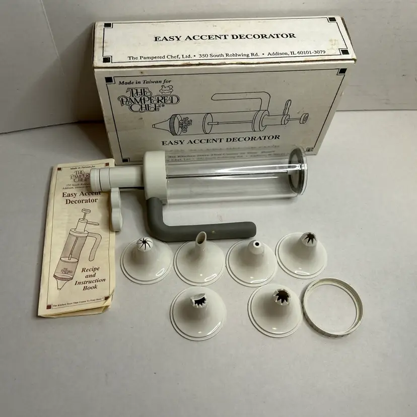 The Pampered Chef Easy Accent Decorator is a vintage open box set that includes 6 white plastic nozzles and a total of 7 items in the pack. Designed for all occasions, this kit is perfect for adding decorative accents to your baked goods. With the Pampered Chef brand known for quality kitchen tools, this set is sure to help you create beautifully detailed designs on your cakes and pastries.