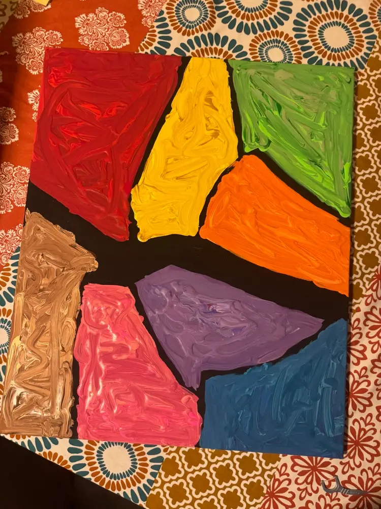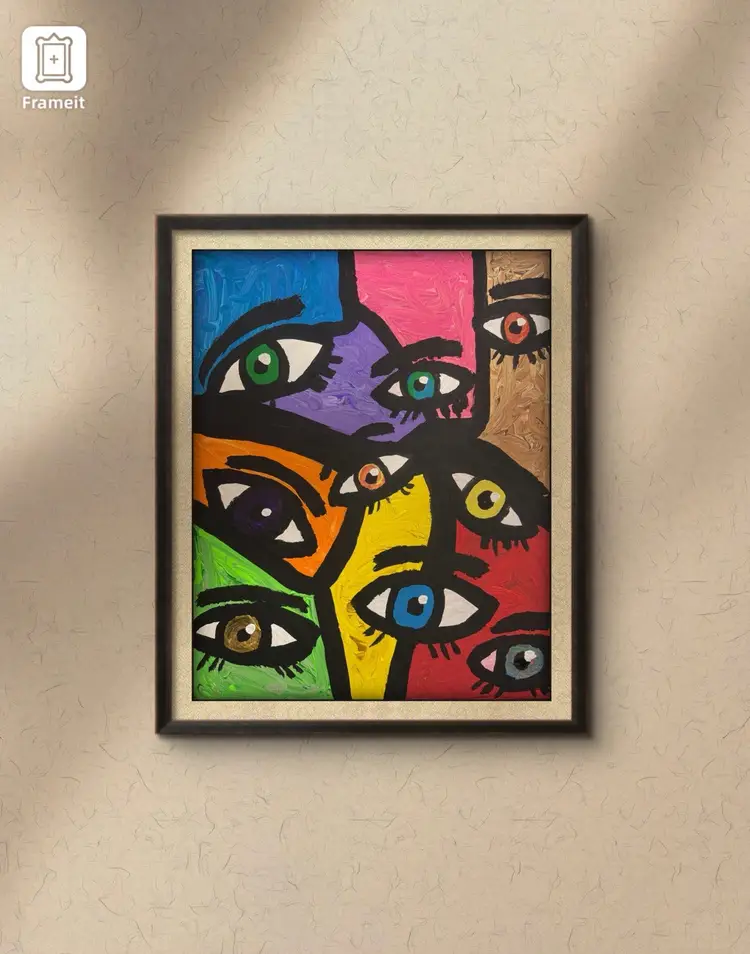 Description: The Room Where His Mind Broke captures the final internal landscape of a man unraveling. Fragmented and bold, each block of color contains an eye—some wide with panic, others hollow with resignation—staring in different directions, never quite meeting. The black dividing lines are not just borders; they are ruptures, signaling a fractured psyche struggling to contain both joy and despair in equal measure. The vibrant tones—yellow, red, green, blue—aren’t signs of life, but symptoms of emotional extremes: mania painted beside paralysis, hope pressed against devastation. Each color fights for dominance, but none can quiet the noise. This piece isn’t a scream—it’s what happens when the screaming has gone silent.