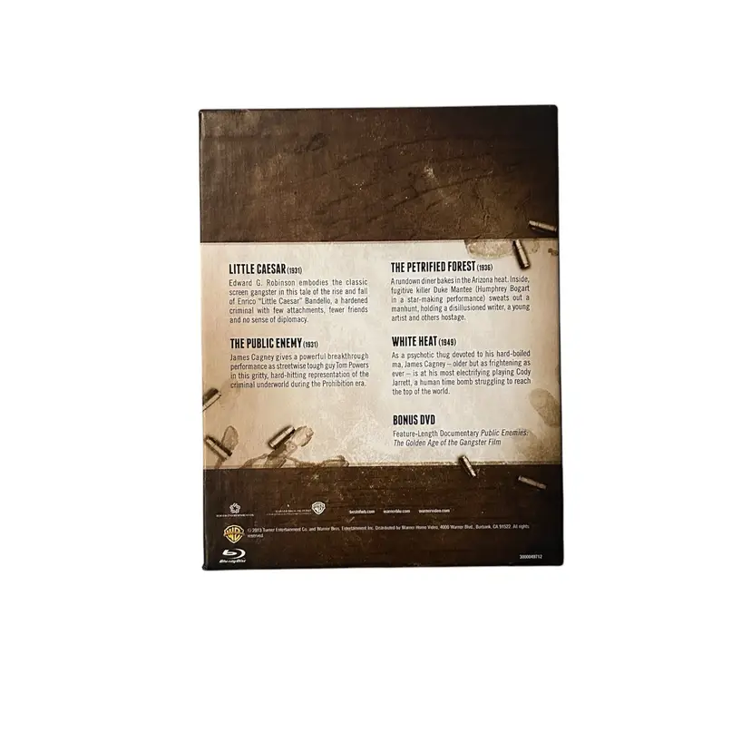 The Ultimate Gangsters Collection Classics Blue Ray 4 Disc Set By Warner Bros. Pre-owned good condition. Special edition that includes hardcover information booklet. Movies are: Little Caesar, The Public Enemy, The Petrified Forest, White Heat, & a bonus disc documentary.