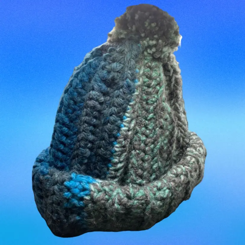 This is an extra thick adult small/medium winter crocheted hat with a handmade pompom. It is around 25 inches around and long enough to wear as a slouchy hat.