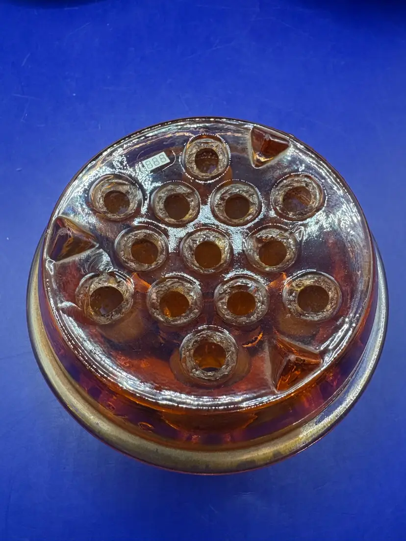 Thirteen hole amber flower frog Measures 4 inches round Side as “Pat April 11, 1916” In excellent shape no crack