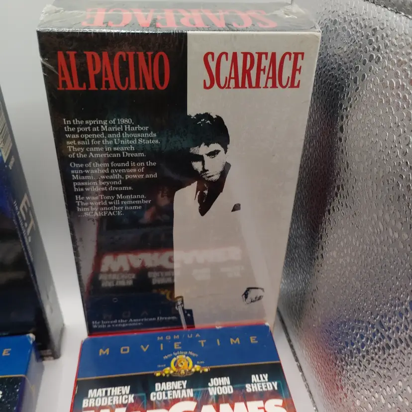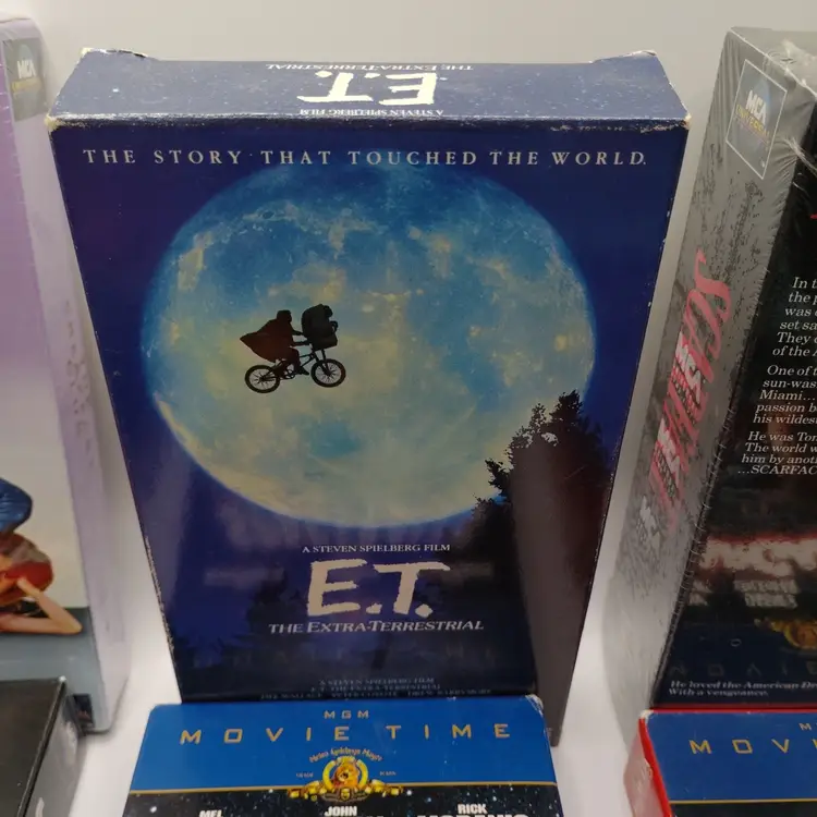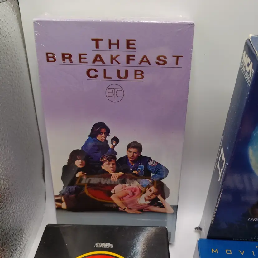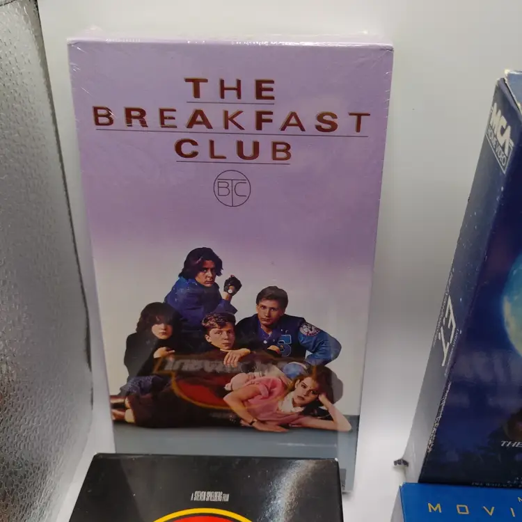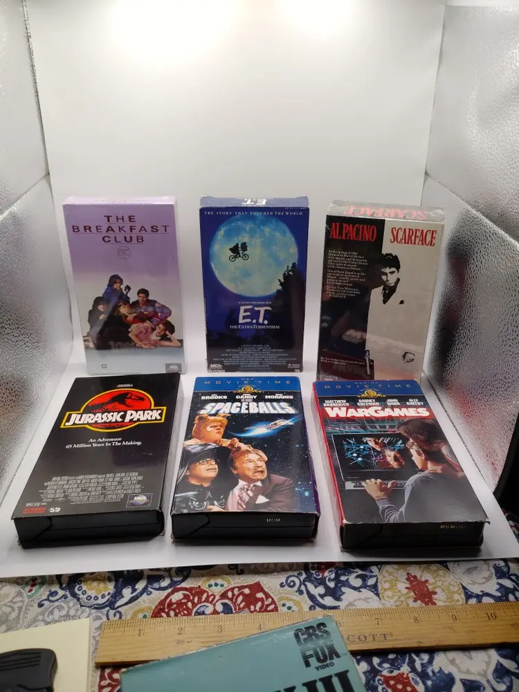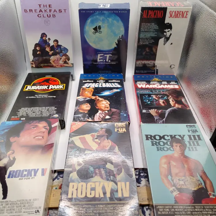 This lot of 9 VHS included The Breakfast Club, E.T., Scarface, Jurassic Park, Spaceballs, WarGames, and Rocky 3,4,5