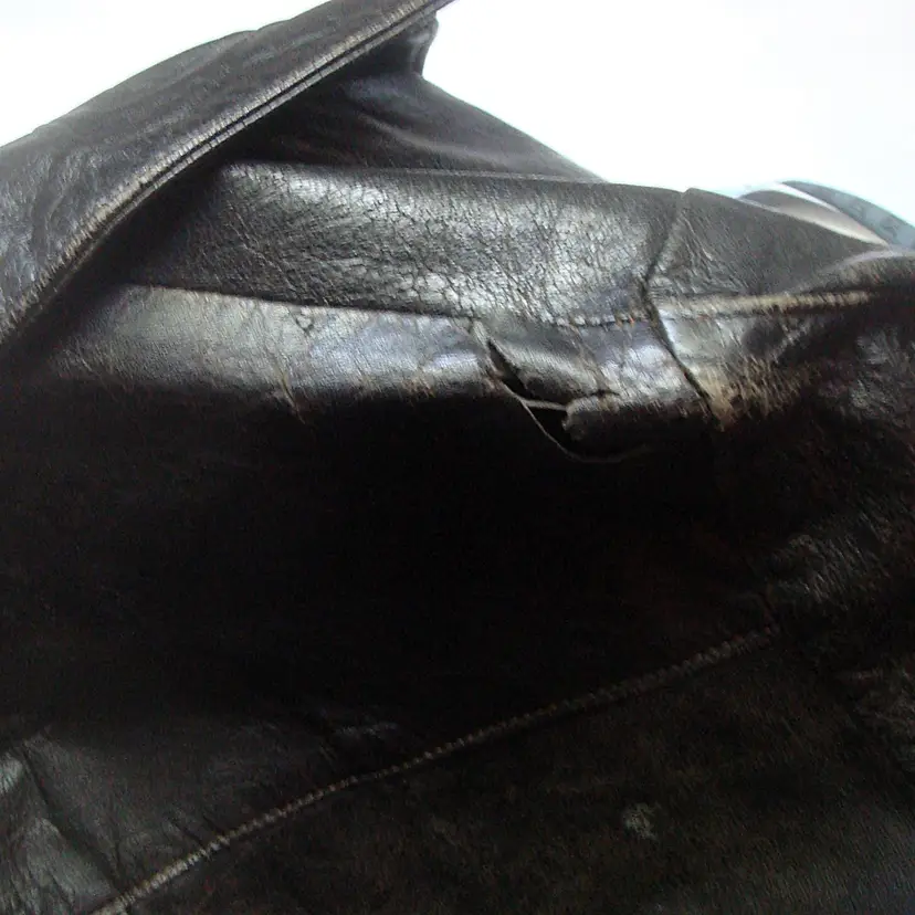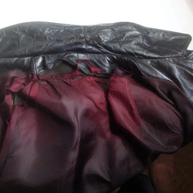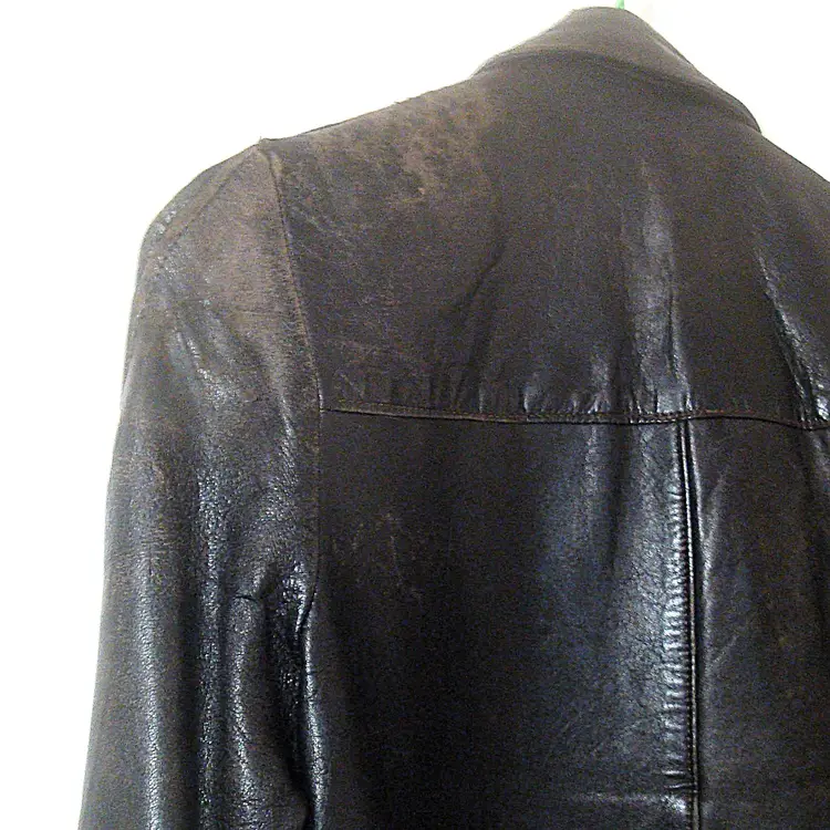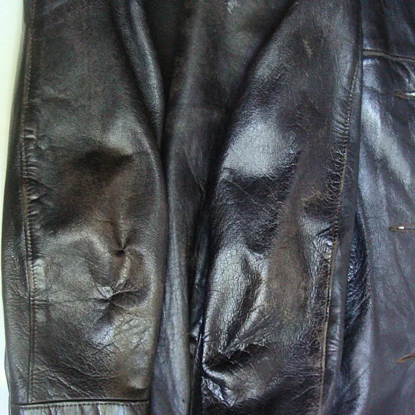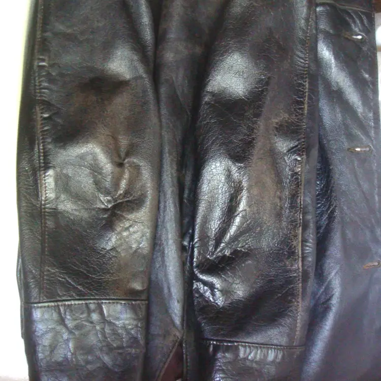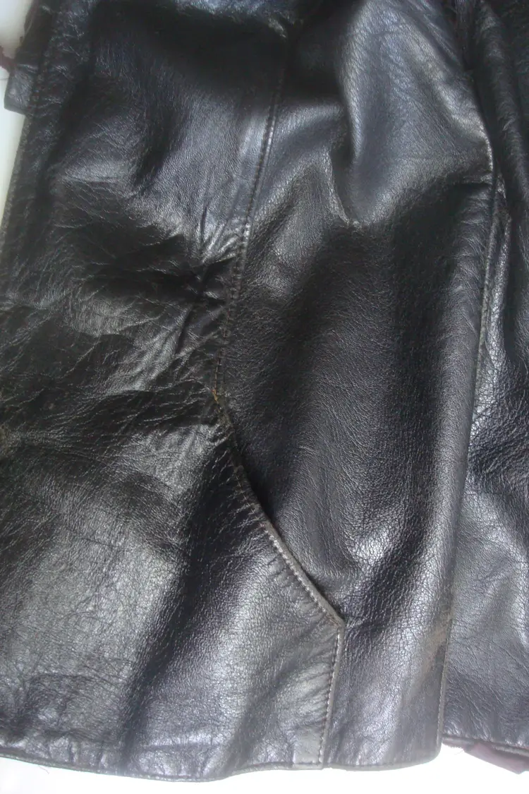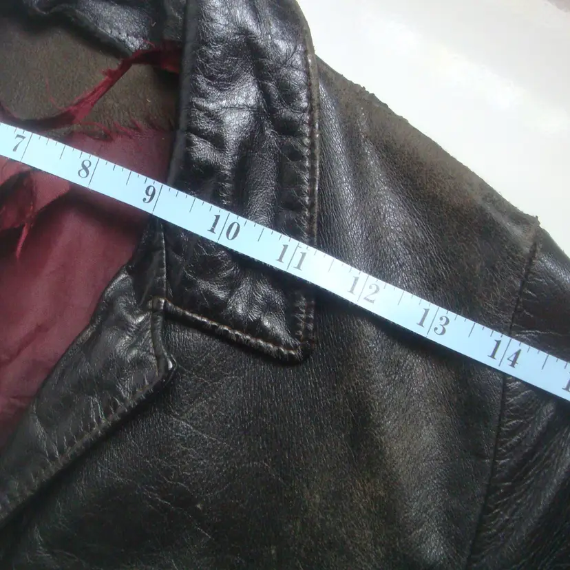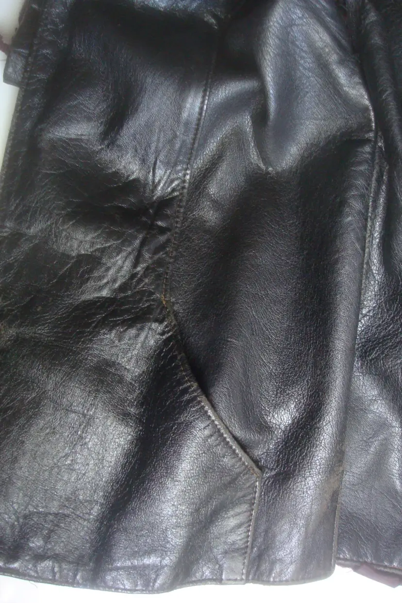 Authentic wear with split leather, discoloration; ragged, faded lining. See photos for condition. Top 2 buttons only. Size: XS/S approx. No label, size tag. Pre-1990s.