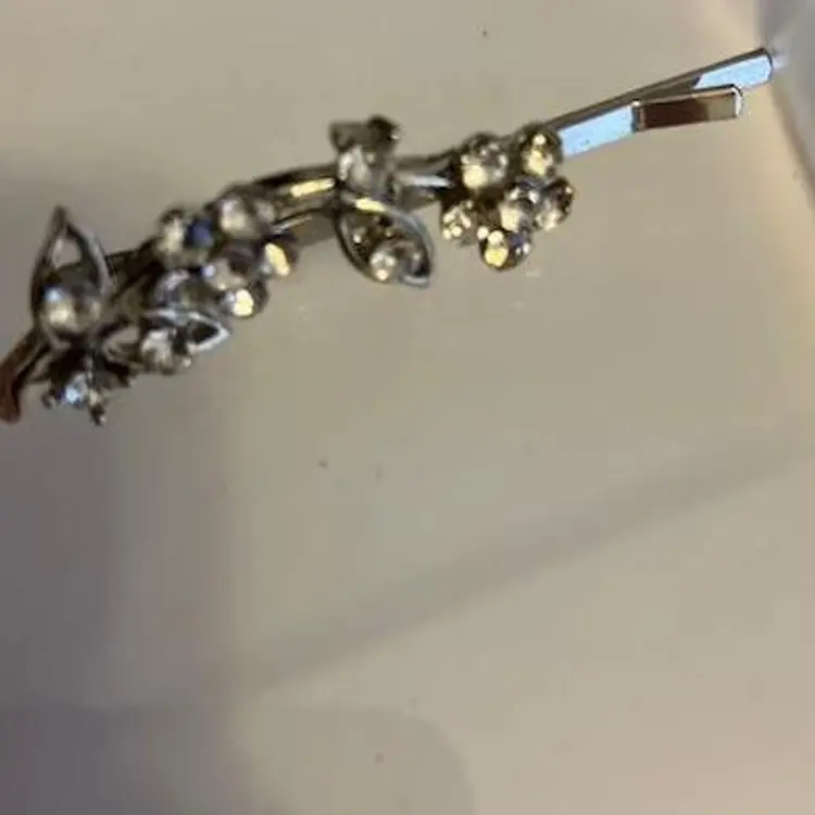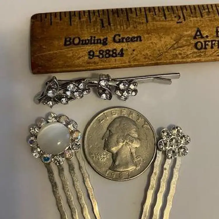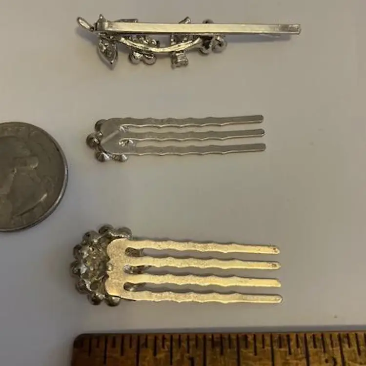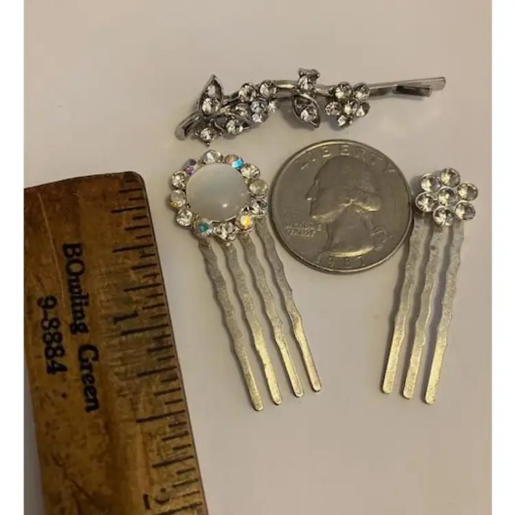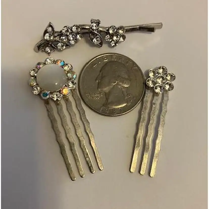 Three silver tone metal rhinestone hair pins. Dainty and delicate. The two 3 pronged pins measure 1 1/2" each. The 3rd one is 1 3/4".