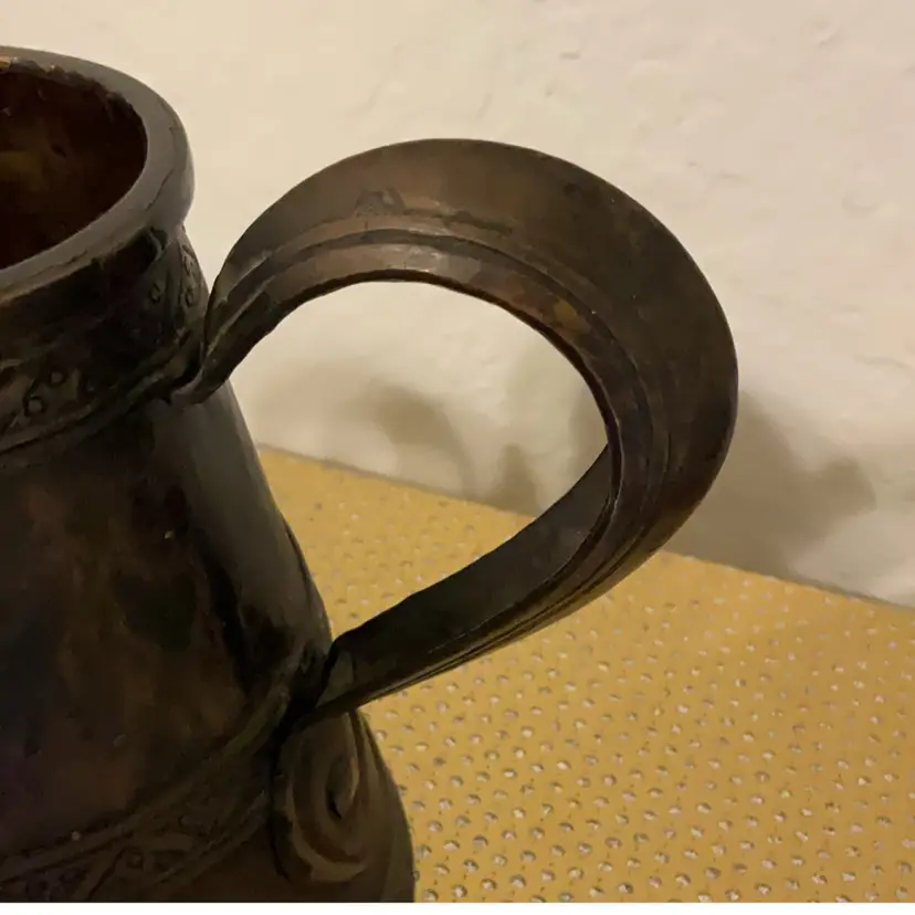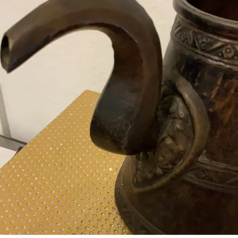 1990’s Tibetan used copper tea pot with no lid stands 6” tall and 5” wide. This is a traditional Tibetan tea pot offering tea or water to altar. It is handmade in Nepal.