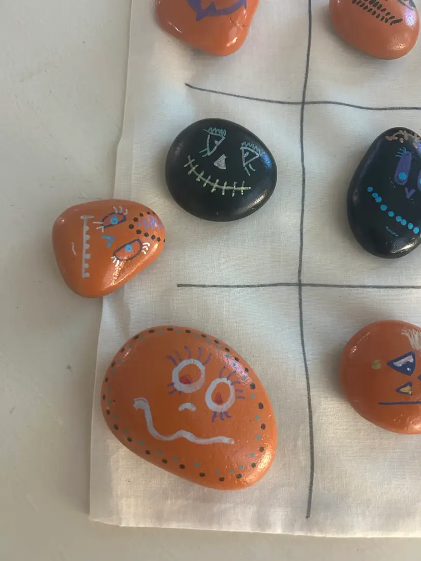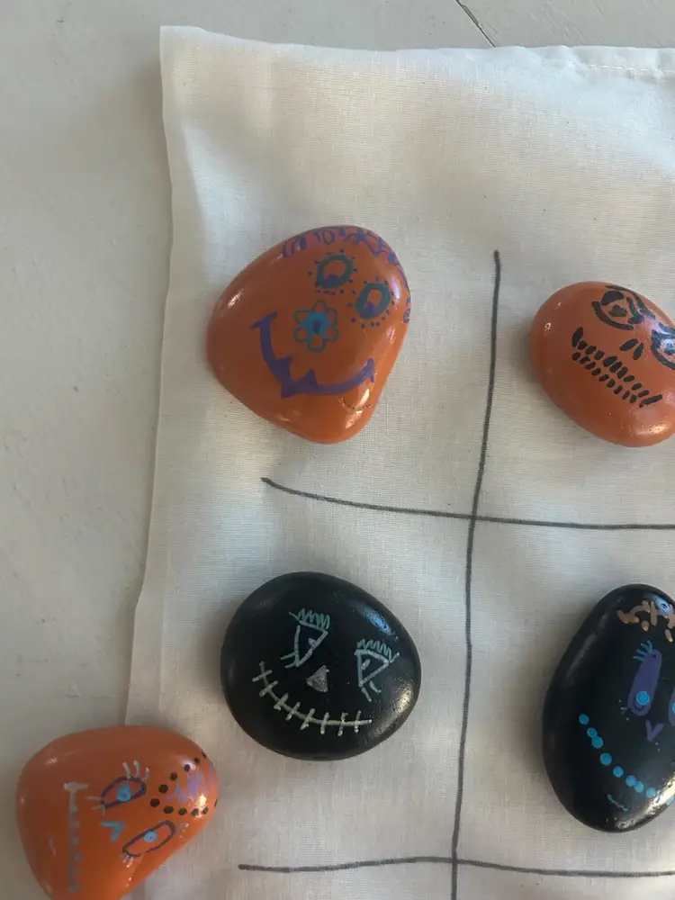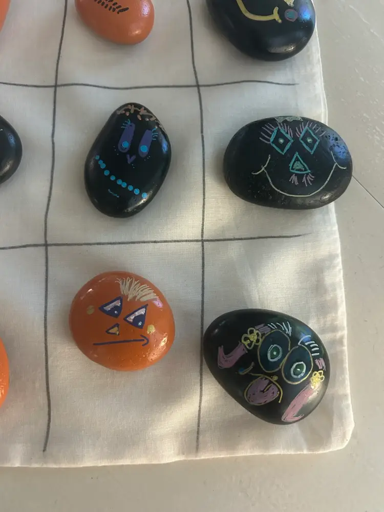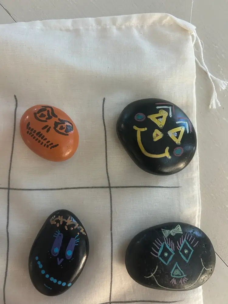 Hand painted rocks that I have in my yard. They come in their own carry bag with the tic tac toe grid drawn on it. These are made to order so it will not match the photos. Since it is made to order you can request colors or designs. Reach out to me before placing your order so that we can work together on ideas. The bag measures approximately 12” long and 10” wide.
