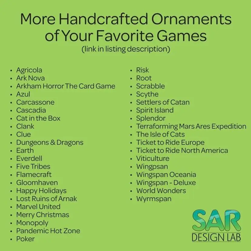 See the entire selection of board game ornaments here: https://www.etsy.com/shop/SarDesignLab?section_id=43550600