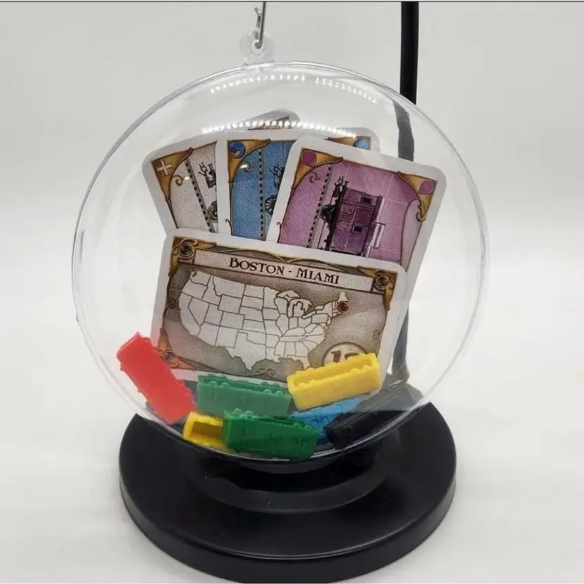 This handcrafted ornament is filled with components from the game: Ticket to Ride North America. The 4" round disc ornament shell is made of ultra-clear, hard plastic. It's the perfect gift for the board game enthusiast that has everything. Gift this ornament to members of your game group, families, or anyone else who would love a unique memento of their favorite game. Includes metal hook.