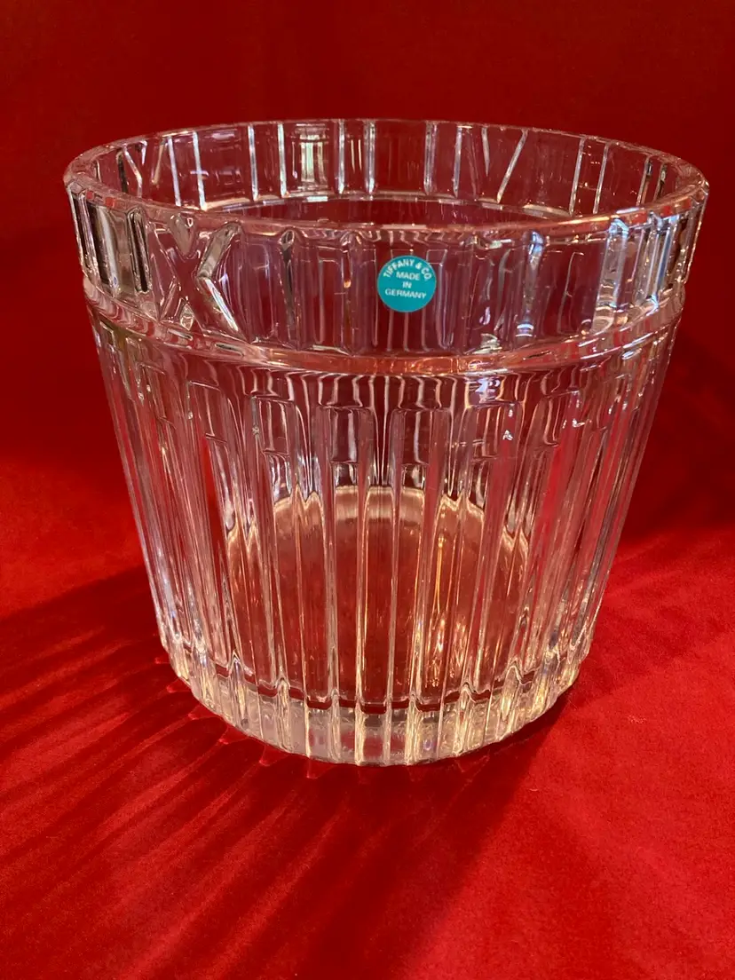 This 100 % lead crystal champagne chiller/ice bucket by Tiffany & Co. in the Roman numeral pattern remains in pristine original condition. No chips, cracks or repairs. Flawless. It measures 71/4 inches tall by 7 1/2 inches wide and weighs 8 lbs. Beautiful! I will only ship this item Priority Shipping!!!