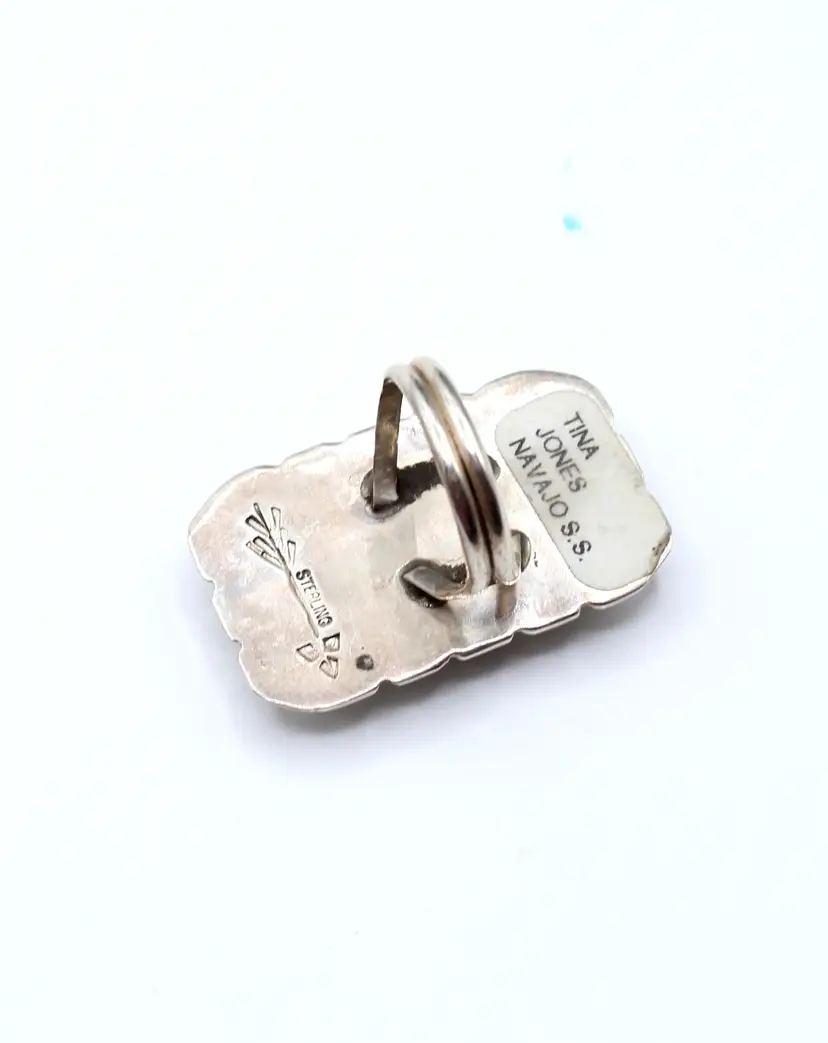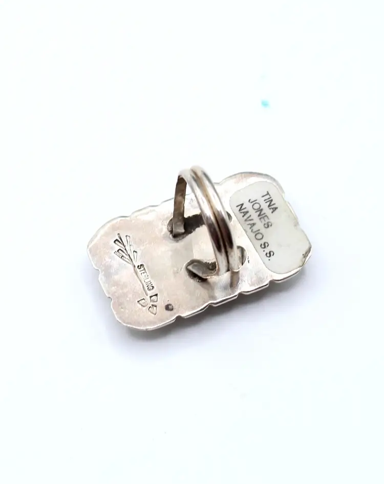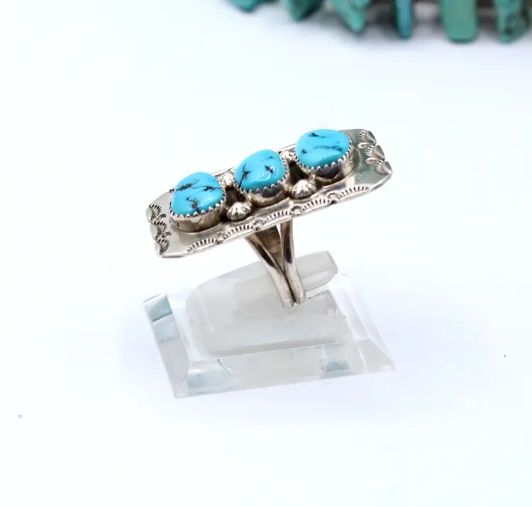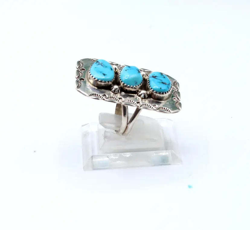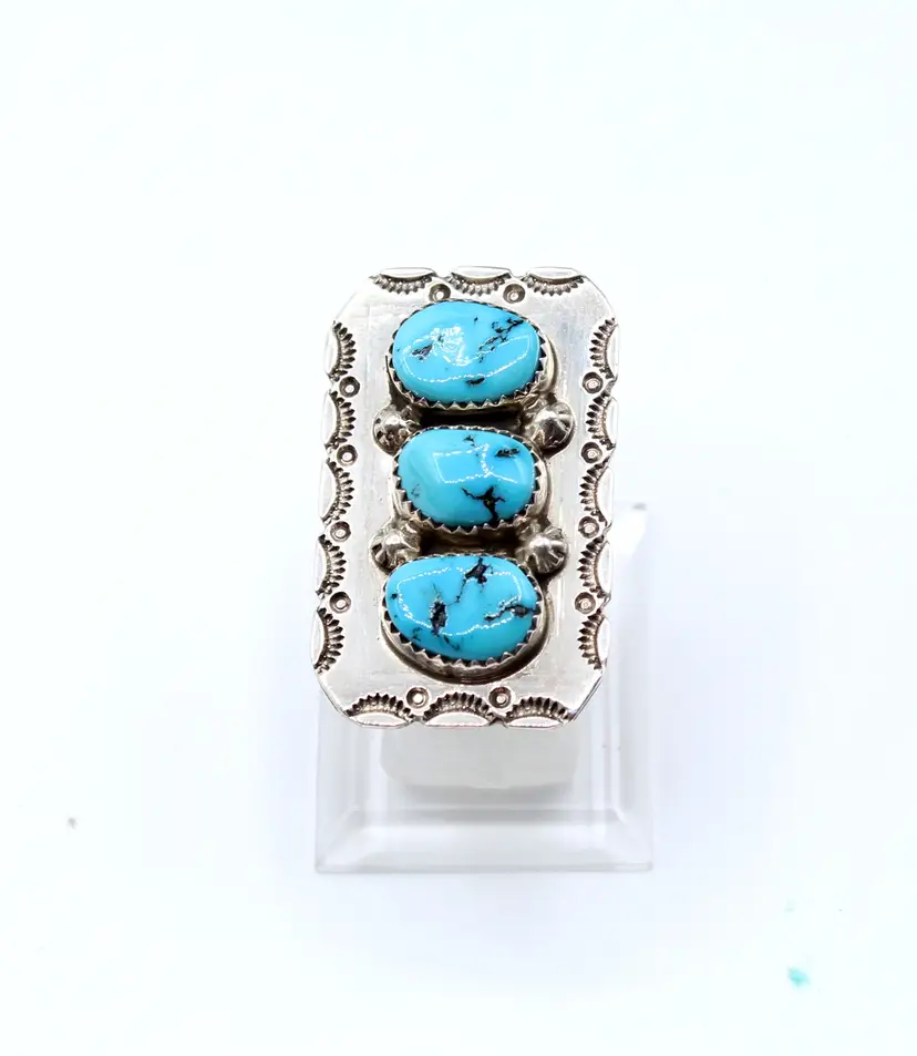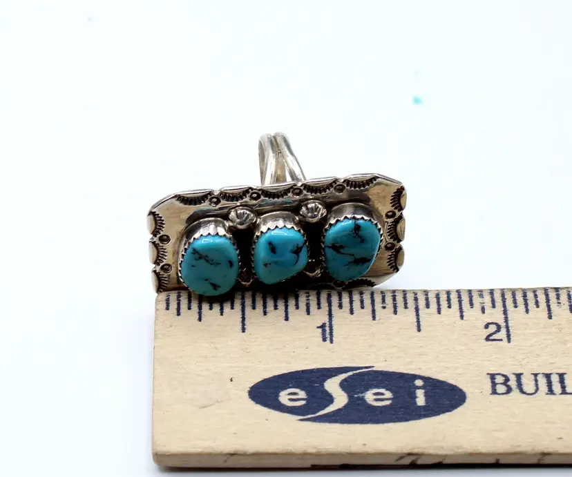 Beautiful signed with an arrow for Tina Jones. New modern ring. Three beautiful nuggets with matrix set in saw tooth bezel and hand stamped flat rectangle back drop. Two wire split shank 4mm band.