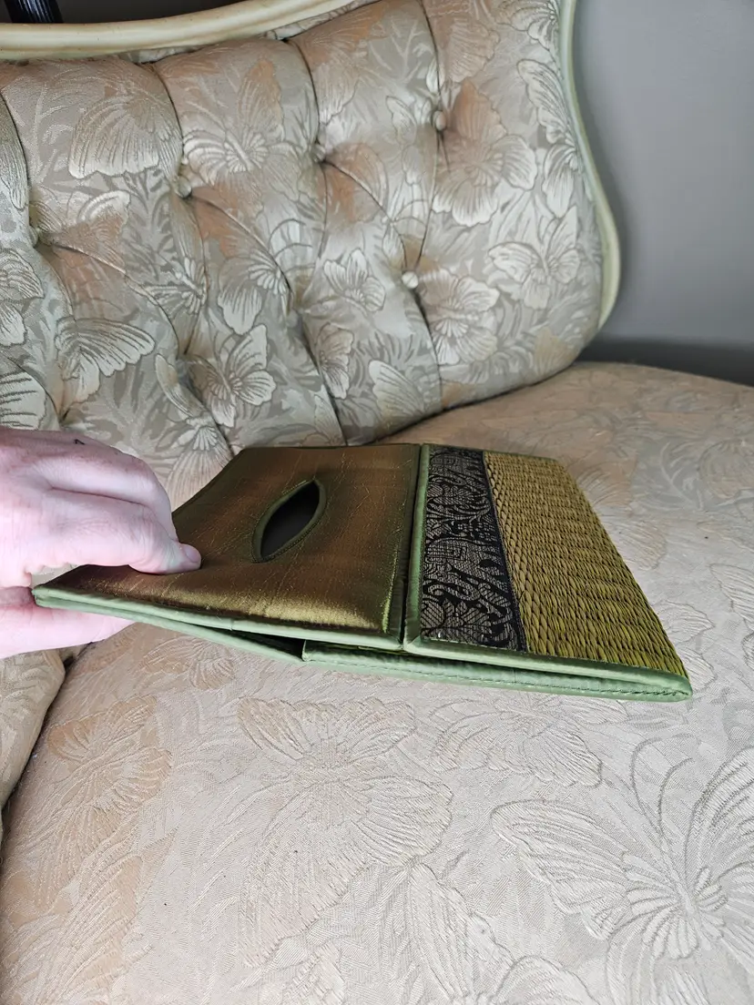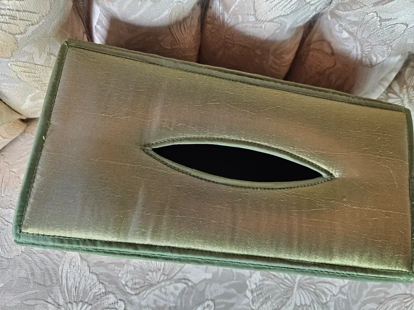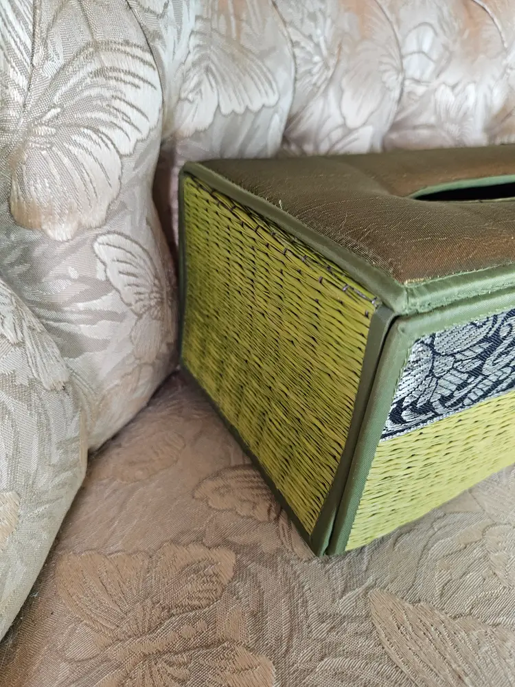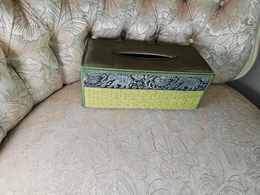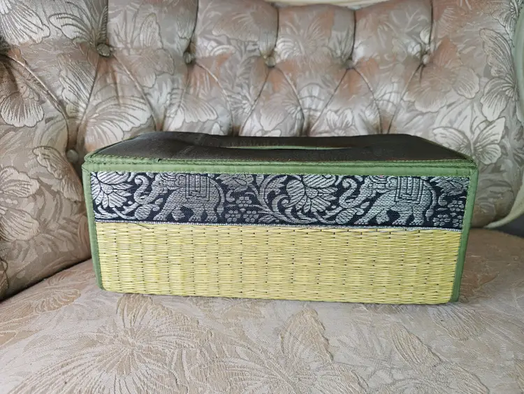 This Thai Tissue Box Cover is a stylish addition to any room in your home. Made from 100% natural materials such as silk and reed, it features a beautiful green color with intricate elephant designs. The rectangular shape and hook & loop closure make it easy to use and attach to your tissue box. This authentic Thai cover adds a touch of elegance to your bathroom, bedroom, or dining room decor. Crafted in Thailand, this original piece is perfect for adults looking to enhance their space with unique and cultural accents.
