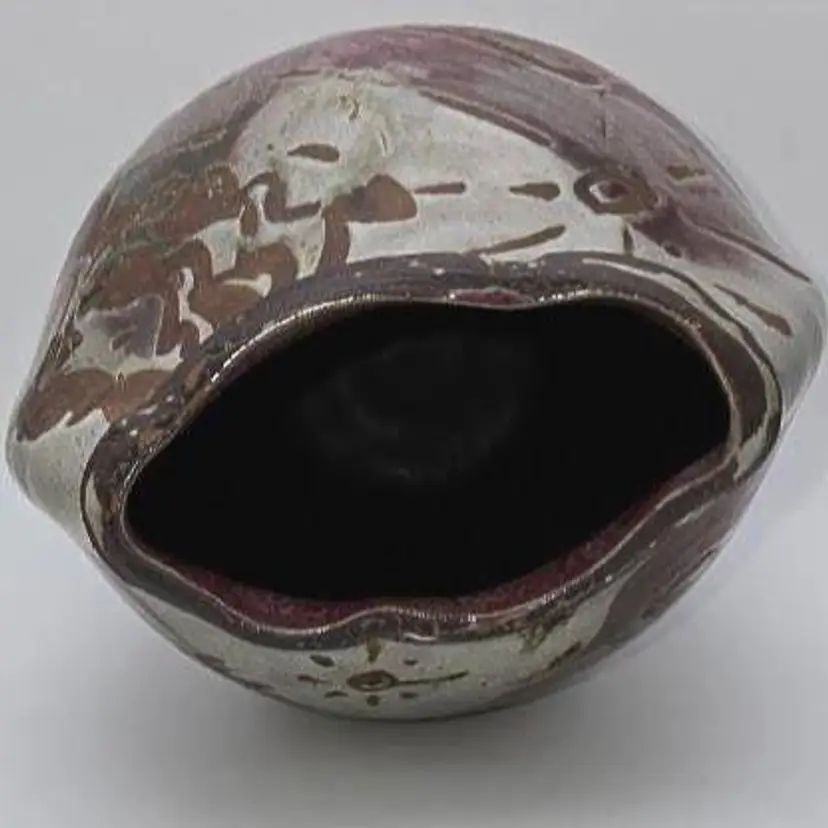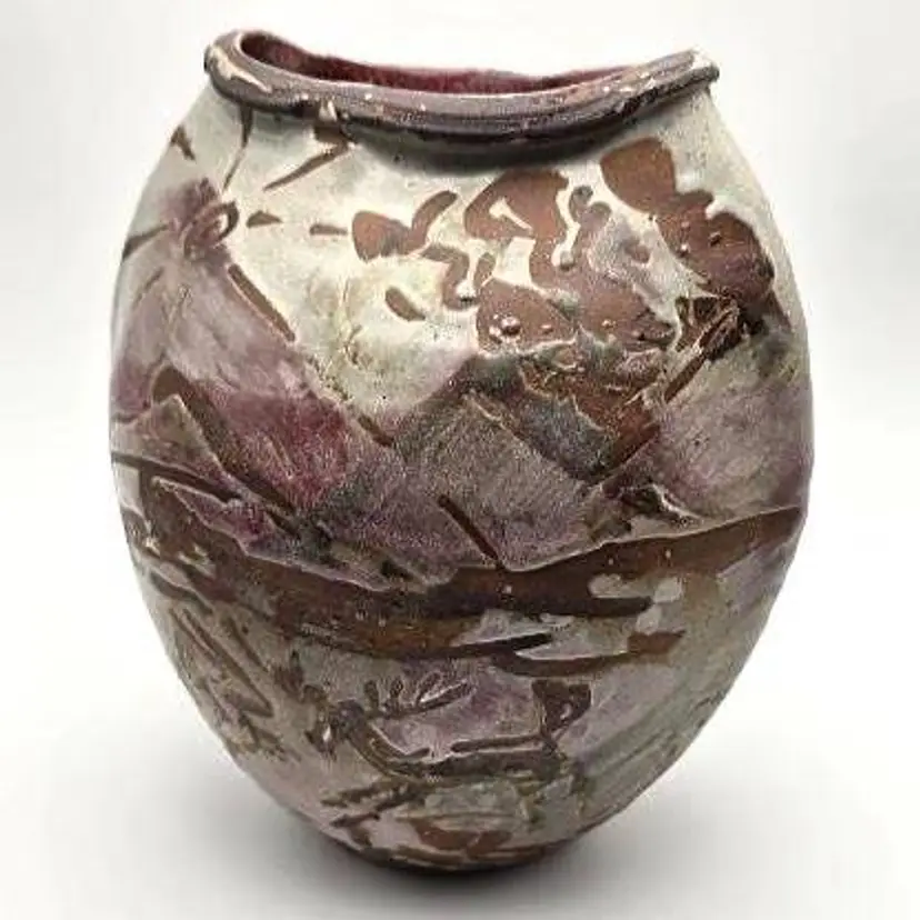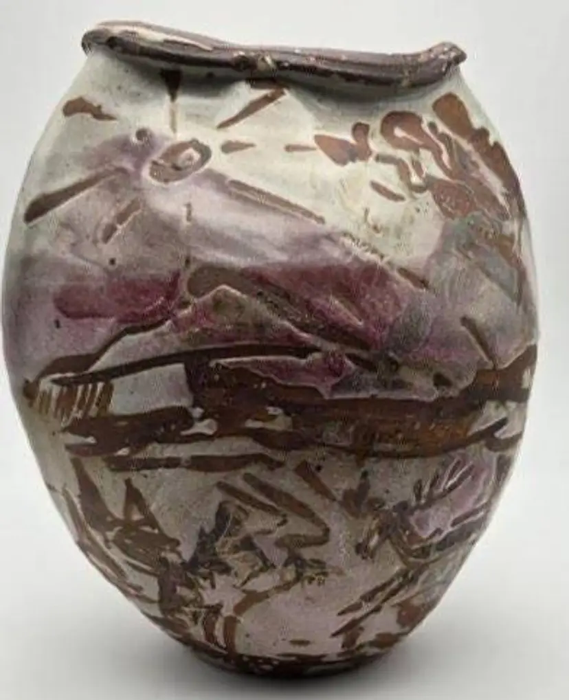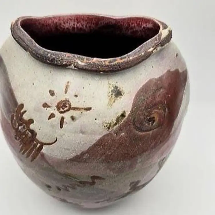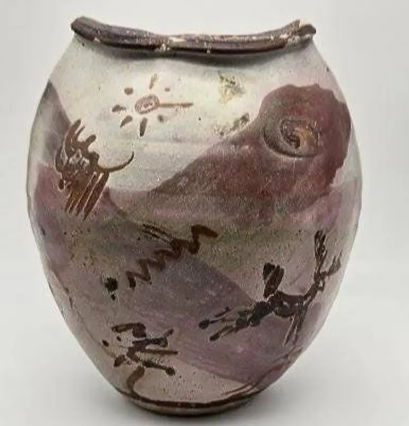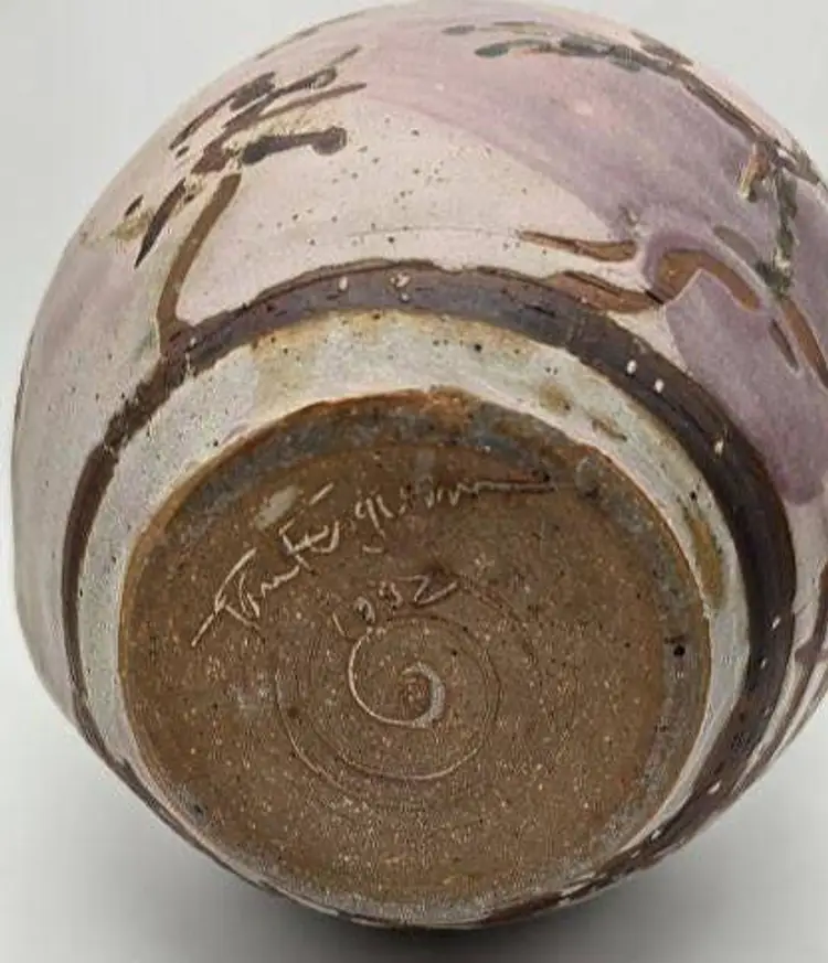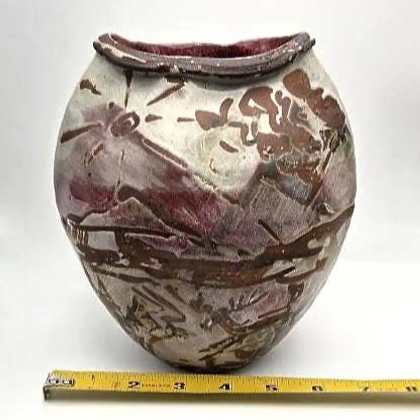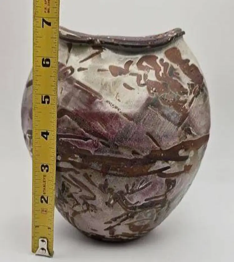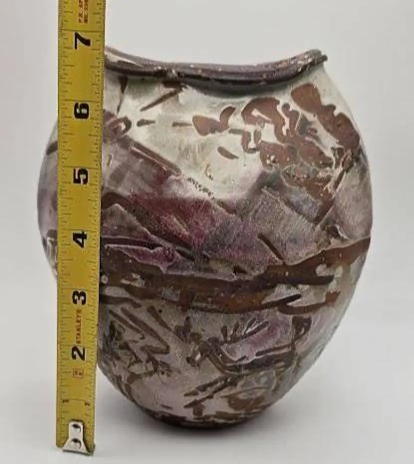 Stunning and unique pottery vase by renowned artist, Tom Ferguson. Signed and dated 1992. Measures 7" tall x 6 1/2" wide x 5" deep and features a Southwestern style in design and color. Very good condition. No chips, cracks or crazing.