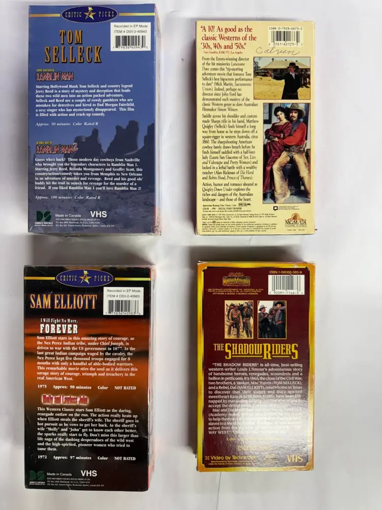 Small selection of VHS movies of Tom Selleck and Sam Elliot. 2 are new and 2 are slightly used