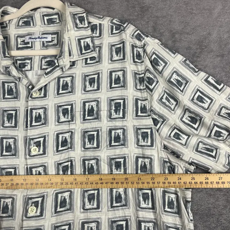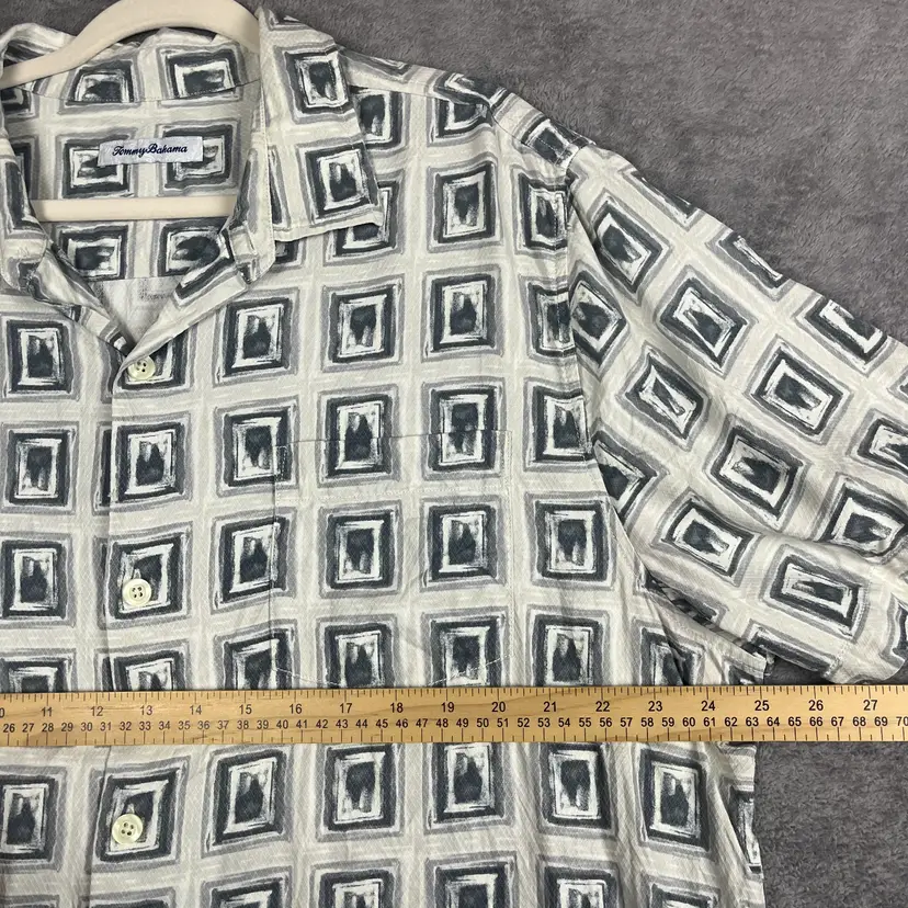 Elegant, breezy, and effortlessly sophisticated—this Tommy Bahama 100% silk shirt combines comfort and island-inspired artistry in one timeless piece. The soft, geometric print in cool gray tones lends a refined yet relaxed feel, perfect for both casual days and resort evenings.