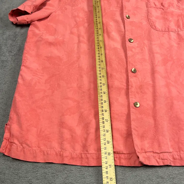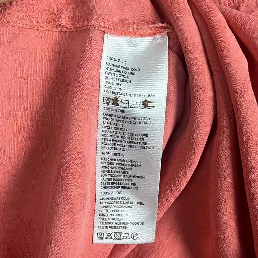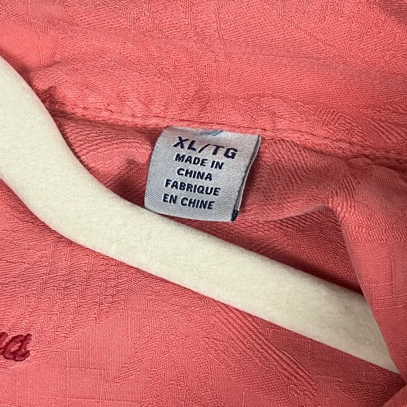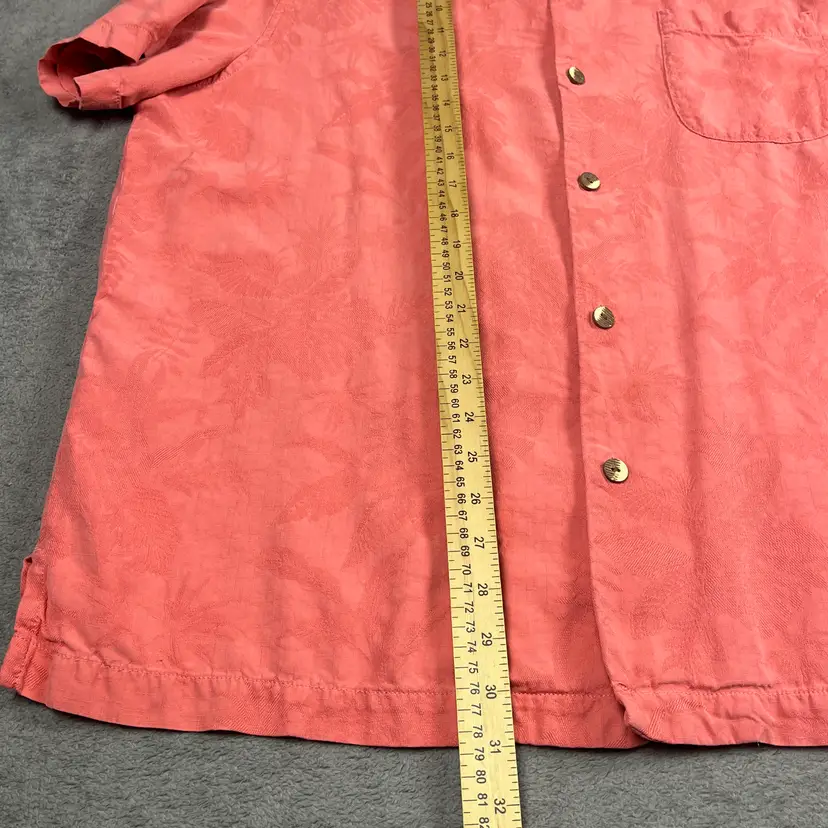 ✨ Details: Color: Coral with tonal palm leaf jacquard pattern Fabric Feel: Smooth, breathable silk with a subtle texture Fabric Content: 100% Silk Care: Machine wash cold, hang dry or dry clean for best results Features: Button front, chest pocket, relaxed fit, side vents Made in China Fabric Note: Naturally cool and soft, silk offers a fluid drape that enhances the shirt’s effortless comfort and refined feel.