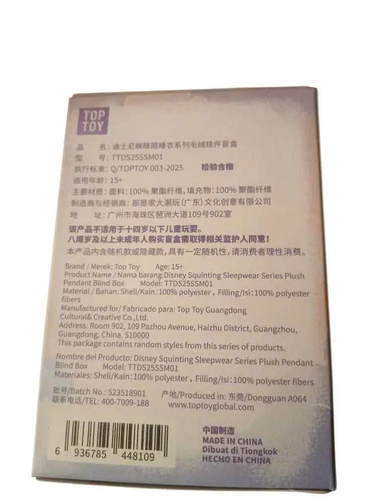 The TOP TOY Disney Squinting Sleepwear Series Plush Pendant Blind Box is a charming and unique collectible featuring a plush pendant keychain/bag charm. This official Disney Collaboration has iconic Disney characters reimagined in adorable sleepwear with squint-eyed details. This is a must-have for fans of the franchise and collectors.