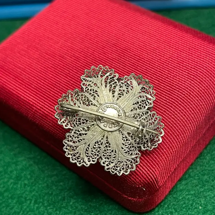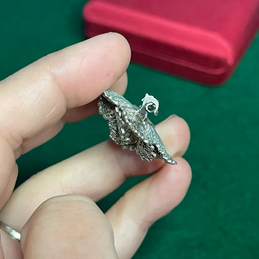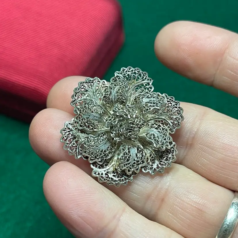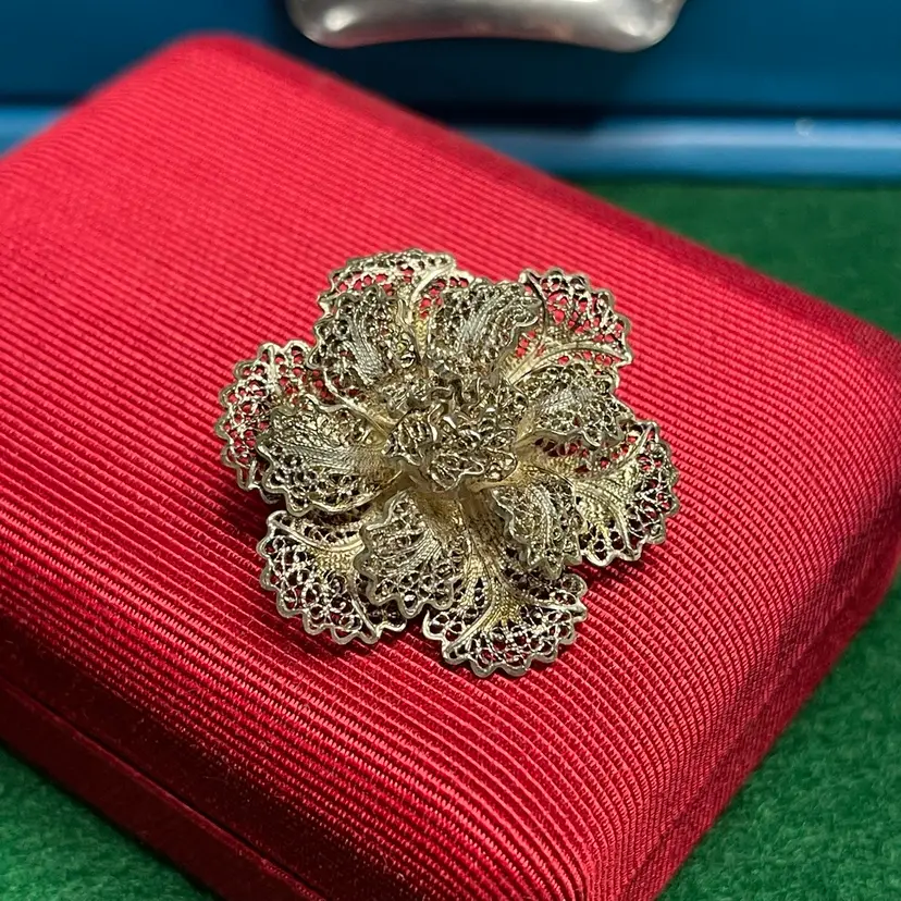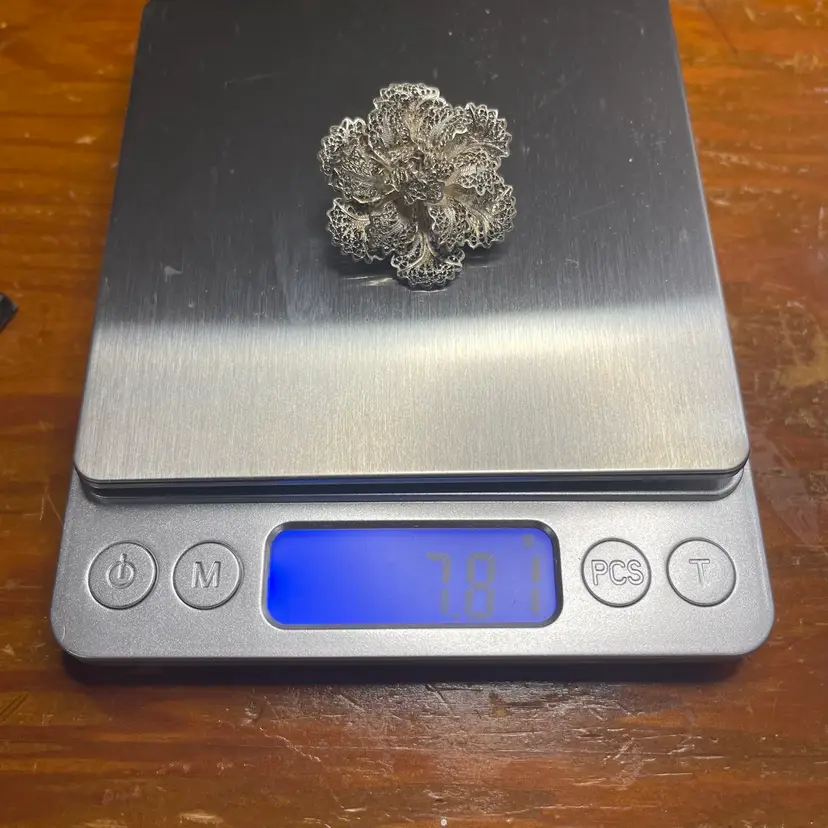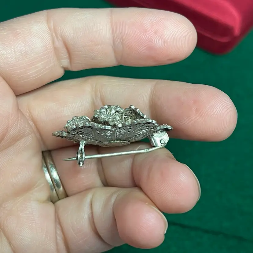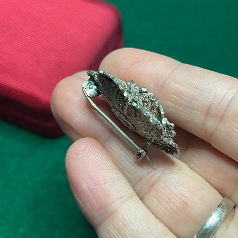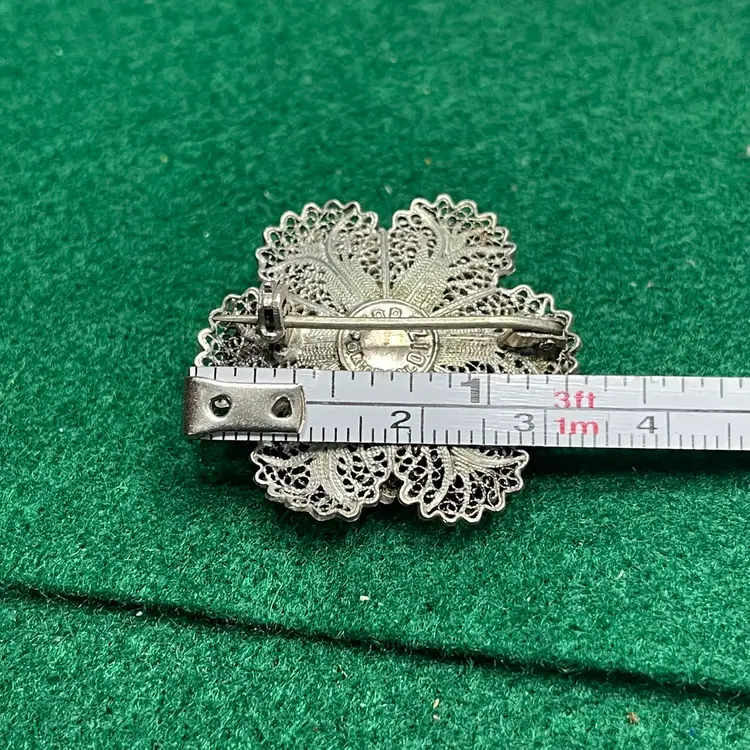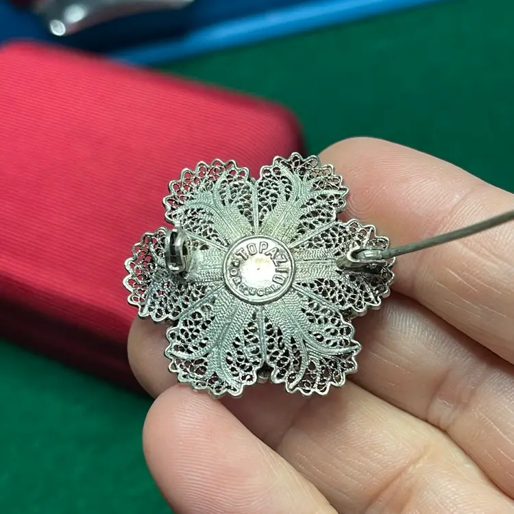 This intricate brooch is in good condition with some bent edges. It is marked as Topazio but isn’t marked with the silver content. It was tested to be 800 or greater purity.