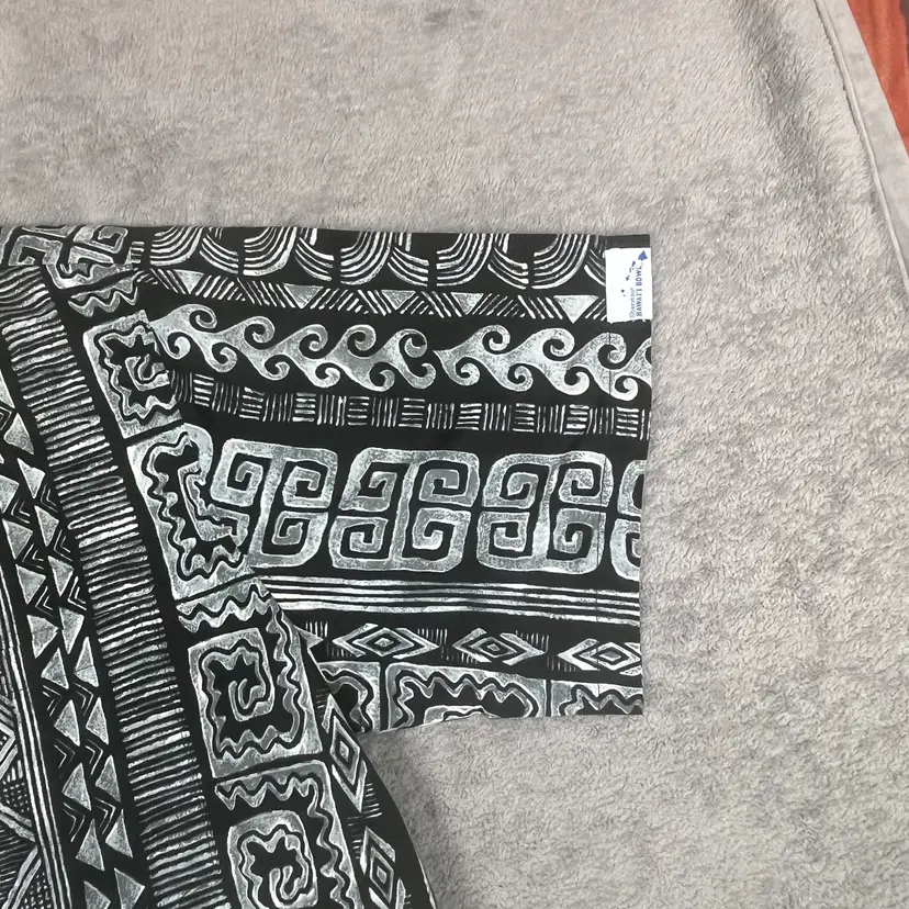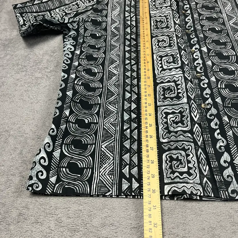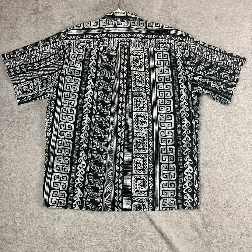 Details: Color: Black and white with geometric and wave motifs Fabric Feel: Smooth, lightweight cotton with a breathable weave Fabric Content: 100% Cotton Care: Machine wash cold, hang dry recommended Features: Button front, pointed collar, short sleeves, straight hem Made in Hawaii, USA of imported fabric Fabric Note: The fabric is soft yet structured—ideal for staying cool while keeping a polished look.