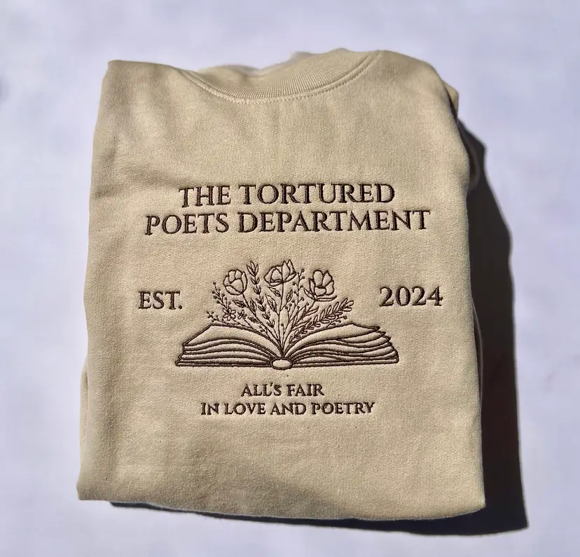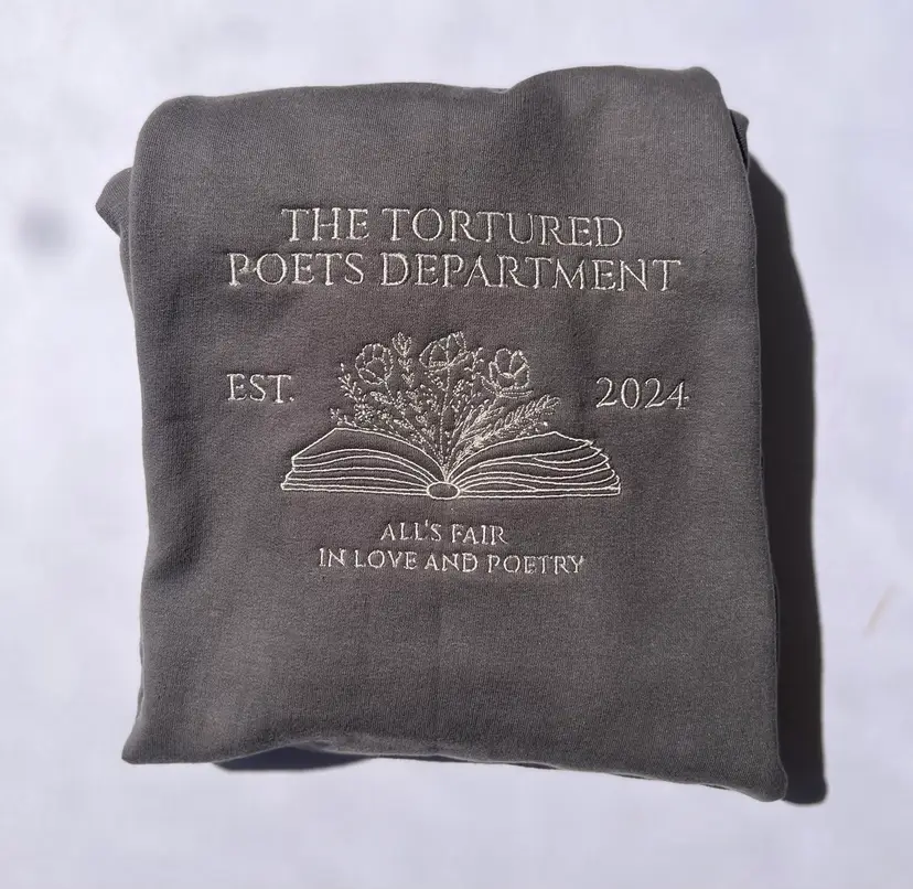 Embroidered sweatshirt inspired by Taylor’s upcoming album, “The Tortured Poets Department” comes in colors Sand and Charcoal.