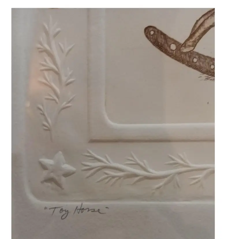 Toy Horse" Etching By David Olson; Beautiful embossed paper; Signed and #152/200; professionally framed 10" x 9.5"; some scratching on frame; stand not included