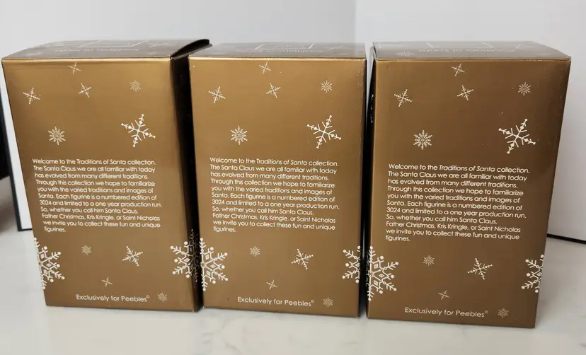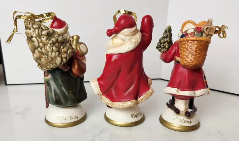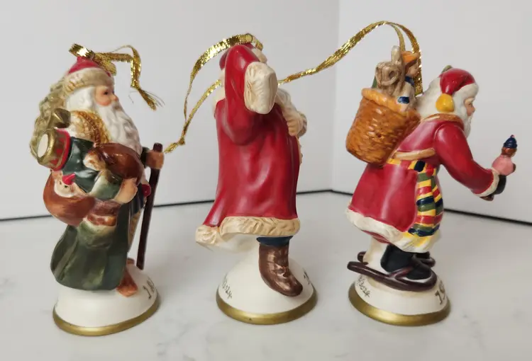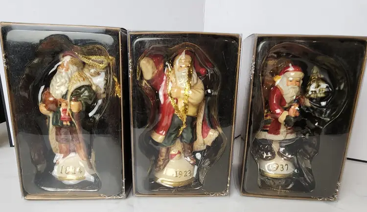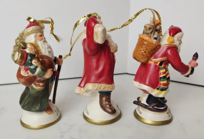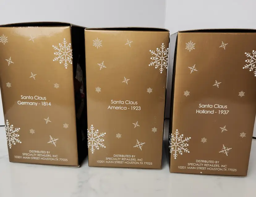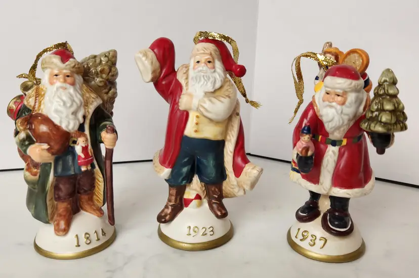 Set of 3 Porcelain Santa Claus Traditions of Santa by Mistletoe Mountain. Created for Peebles, 2009. Set includes Santa Claus Germany - 1814, Santa Claus America - 1923, and Santa Claus Holland - 1937. Approx 5.5 in tall. Lot of 3 with original boxes and the collector card. Limited Edition Series. All are in excellent, like new condition. No chips or cracks.
