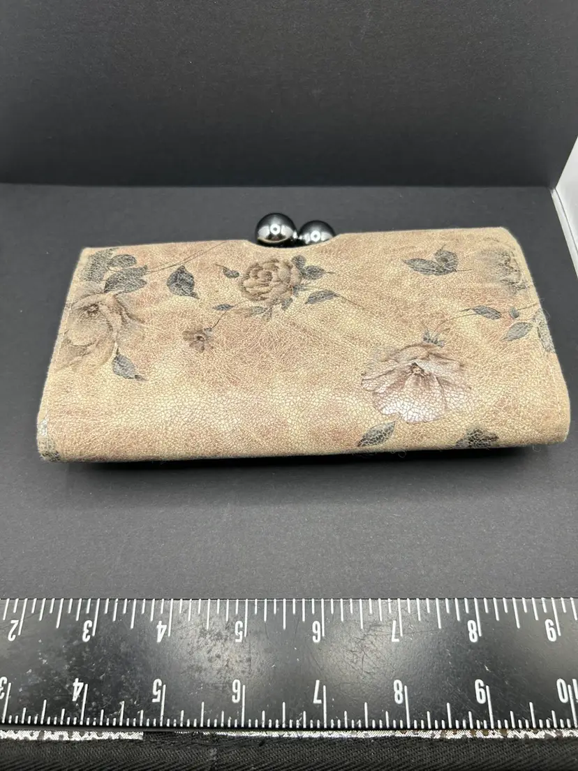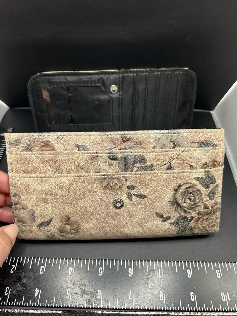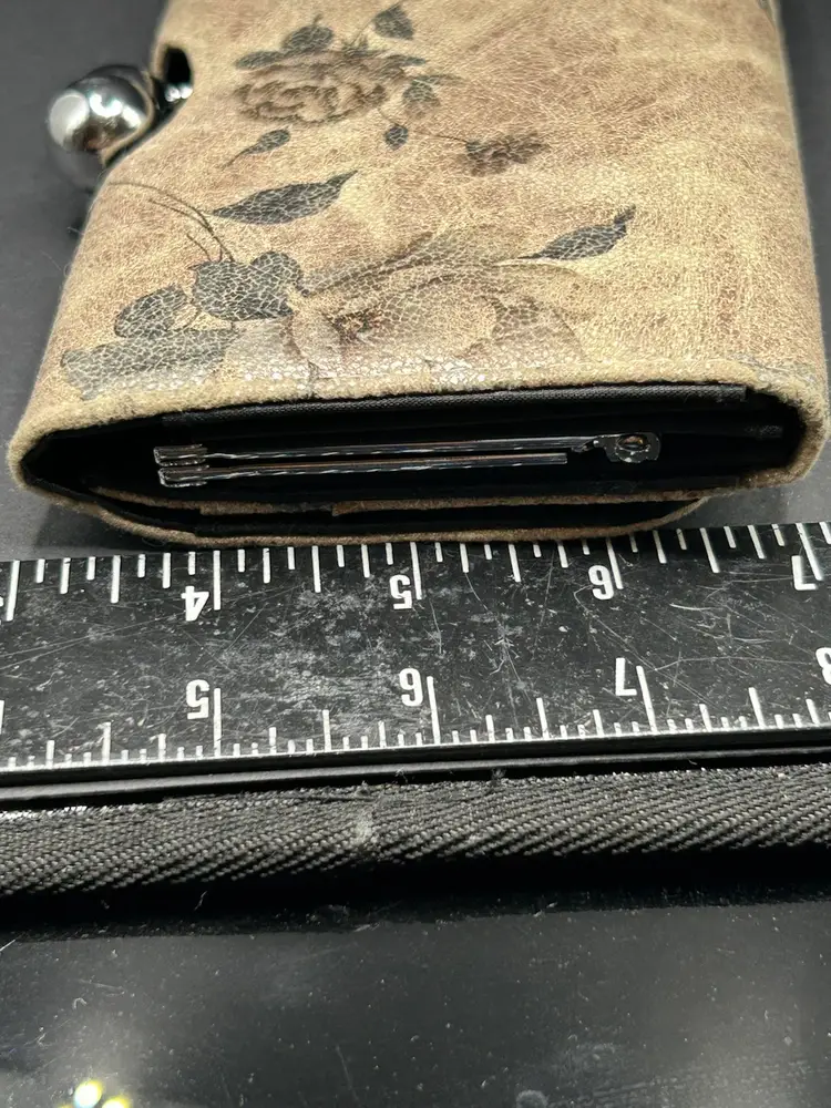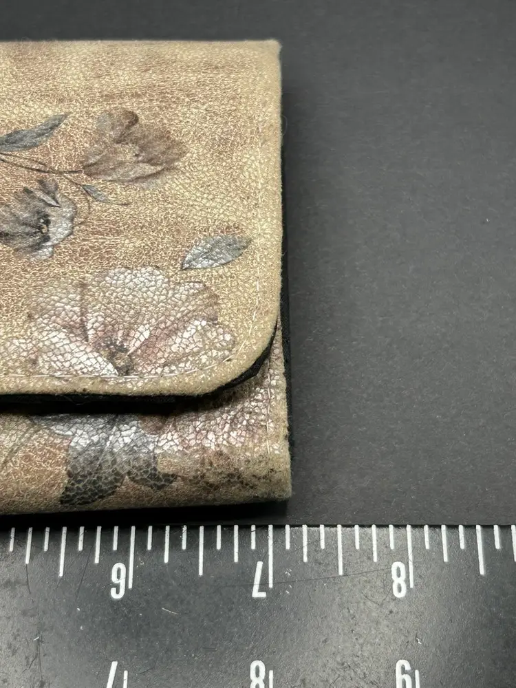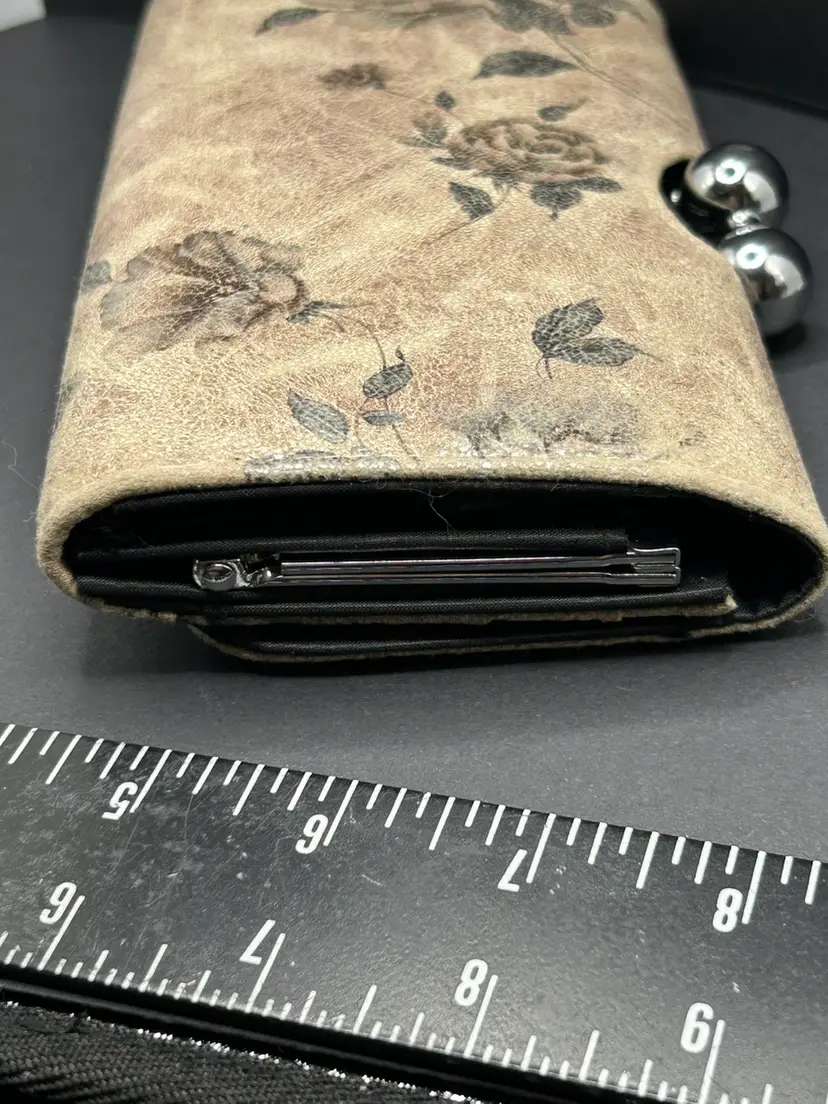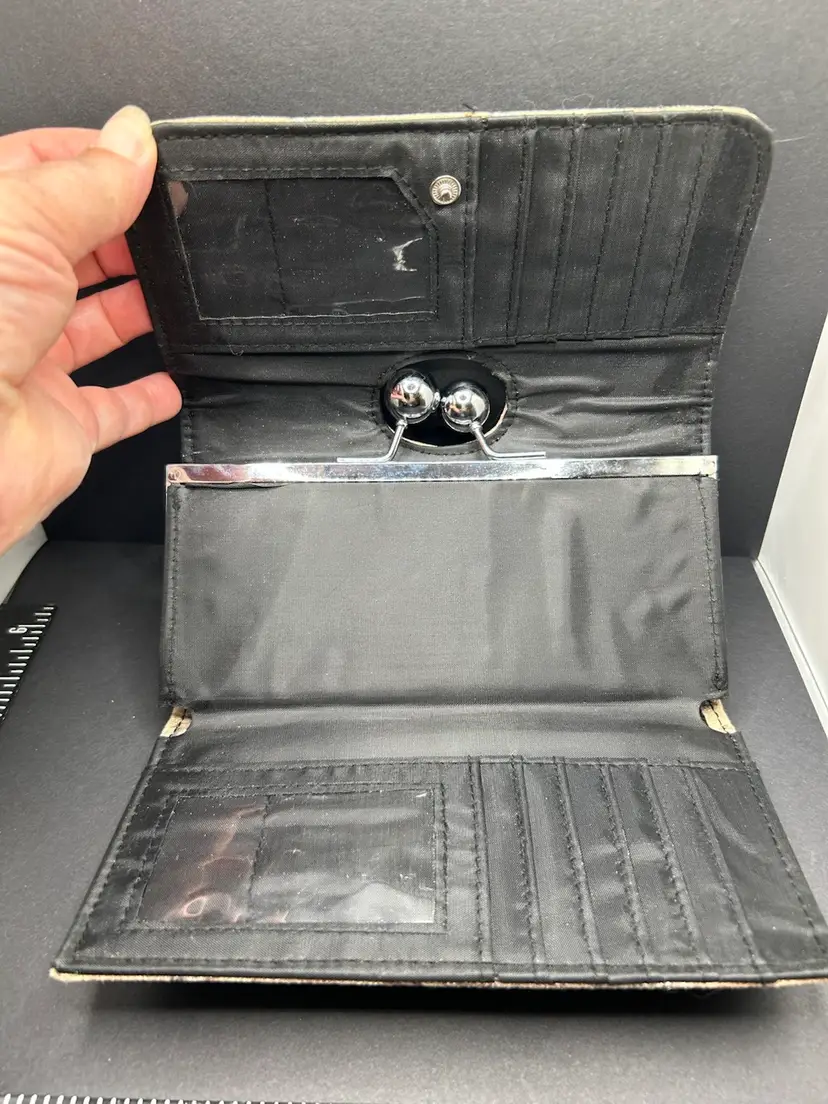 Super cool faux leather trifold wallet so much space inside lots of slots lots of pockets coin purse that has kiss snap closure. Neutral enough to go with everything. Silver floral print on a beige background.