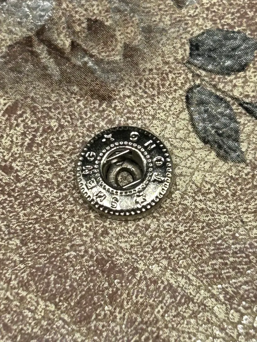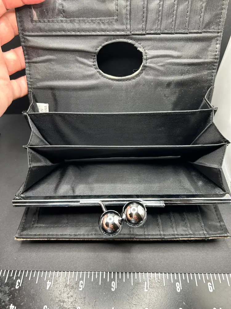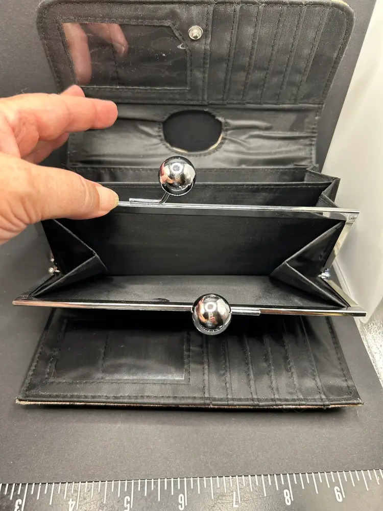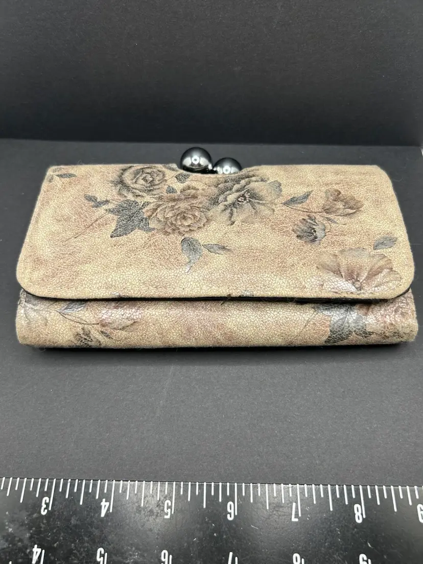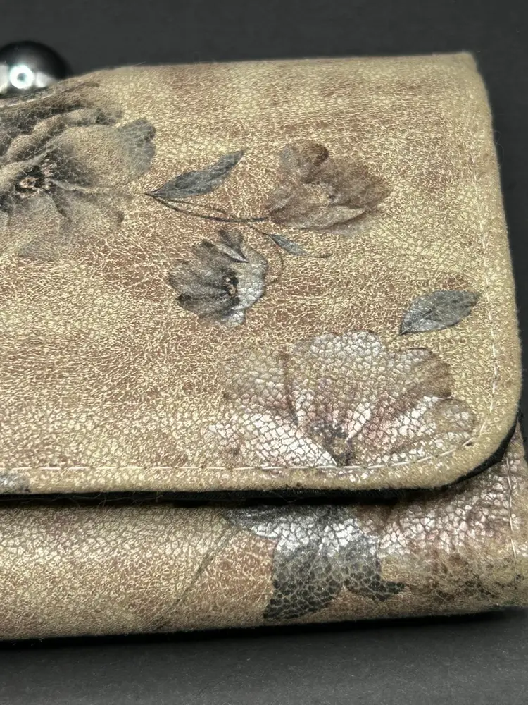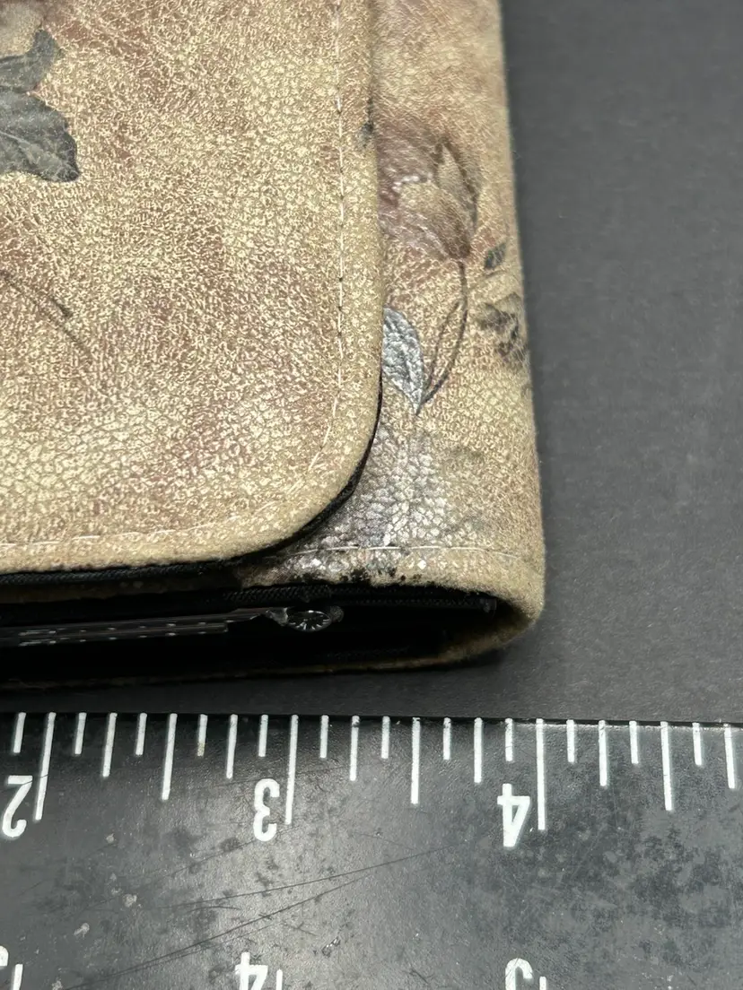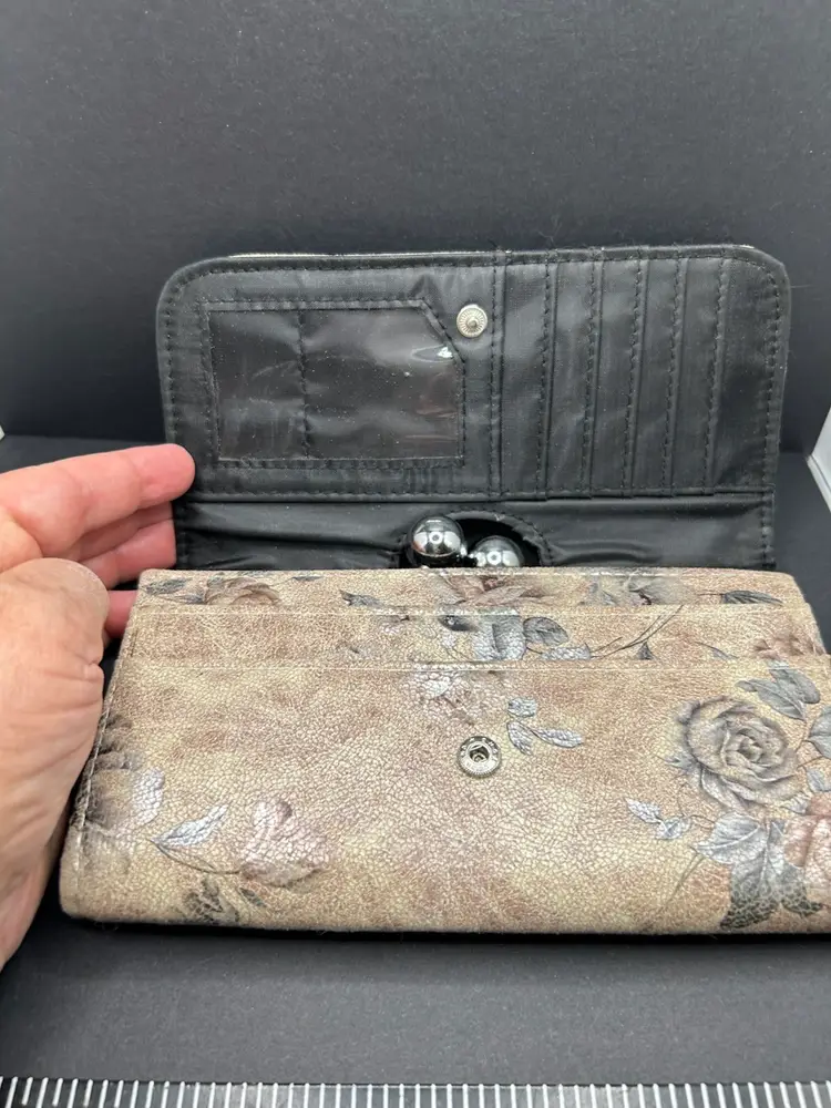 Super cool faux leather trifold wallet so much space inside lots of slots lots of pockets coin purse that has kiss snap closure. Neutral enough to go with everything. Silver floral print on a beige background.