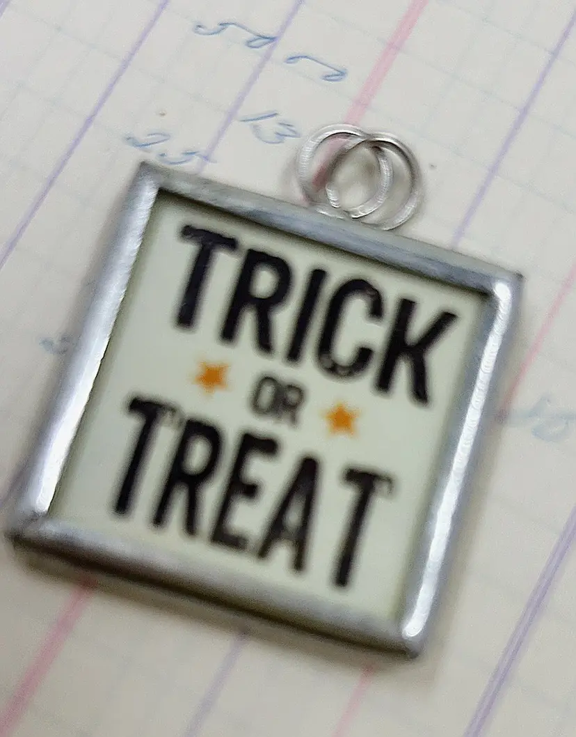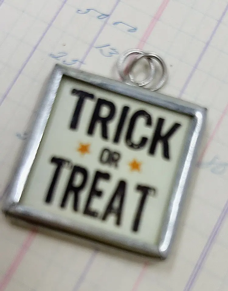 Trick Or Treat Folk Art Black Cat Halloween Pendant Black And Orange Pumpkin In Silver Frame With Loop 1.5”Free Shipping Add to any chain or cord you like!