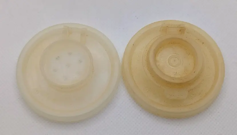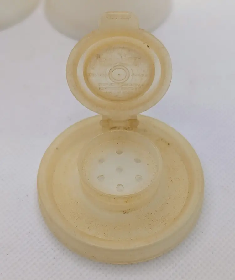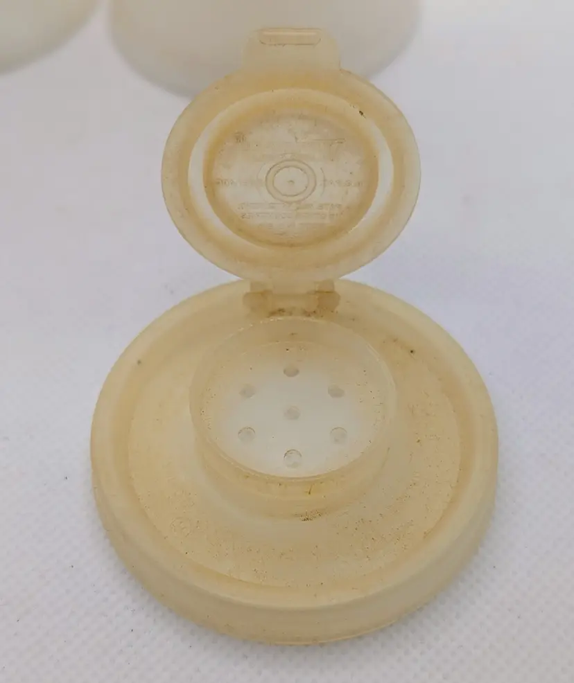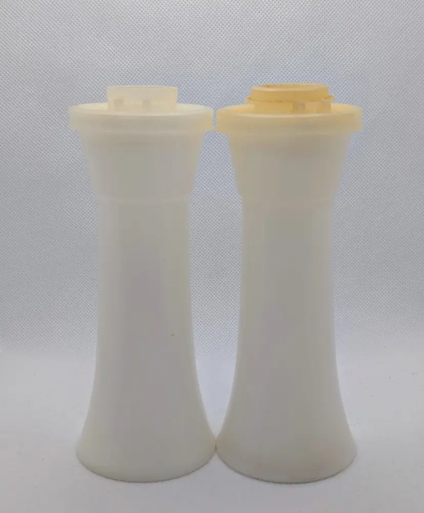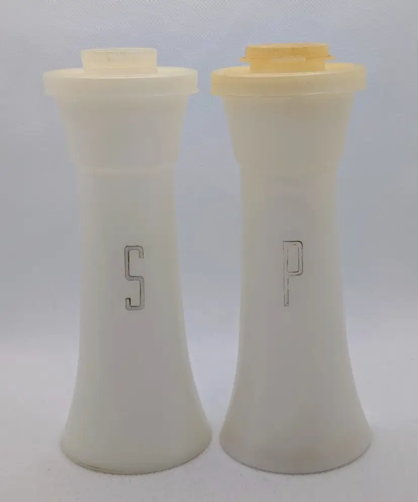 This listing is for a nice vintage set of Tupperware Plastic Salt & Pepper Shakers Hourglass Shape with Flip Tops. Made in the USA. Model 718 White body with Silver lettering. They Stand 6" tall. The one flip top is missing the top and the pepper top could use a good soak to bring it back to its vintage glory. Overall in good shape and great for any Tupperware collectors.