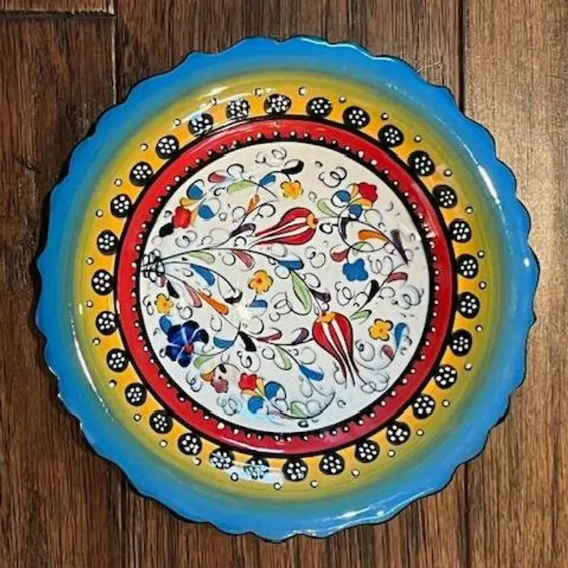 Vibrant and whimsical, hand-painted Turkish ceramic. Turkish designs include tulips, carnations and other florals. Signed on the back, no damage. Amazing pop of color for a Gallery Wall in a kitchen or any room in your home