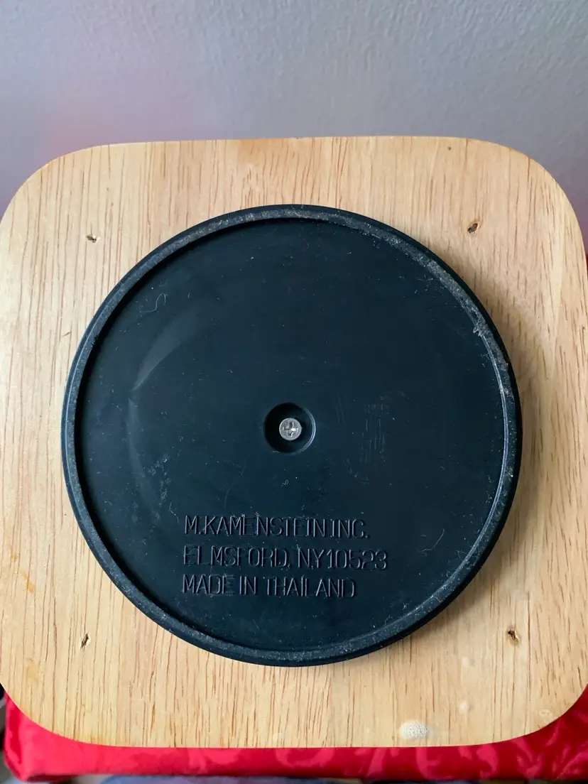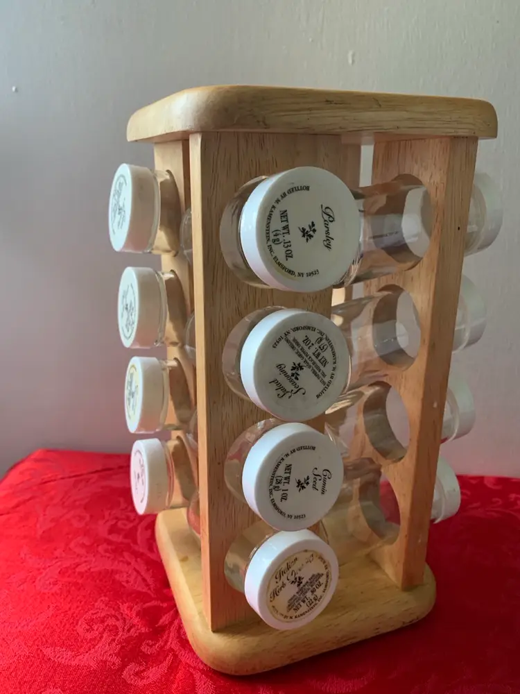 Revolving spice rack with 16 slots for spice jars. This item is missing one of its original glass jars with labeled lid. I have included a green lid for that jar but there is still one jar with a lid missing. I received this spice rack in 1988 for a housewarming gift. In beautiful shape with great price.